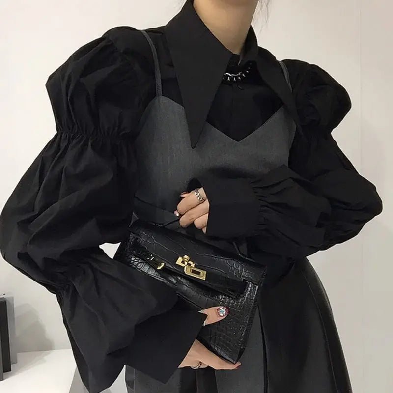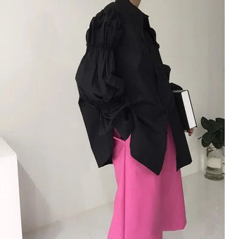 Design: A stylish and elegant blouse featuring puff sleeves and a turn-down collar for a sophisticated look. The shirring decoration adds a touch of texture, making it a perfect piece for both casual and semi-formal occasions.