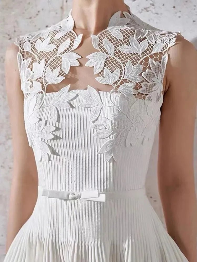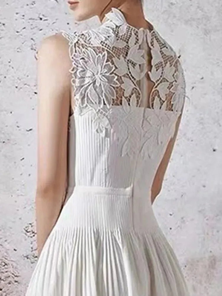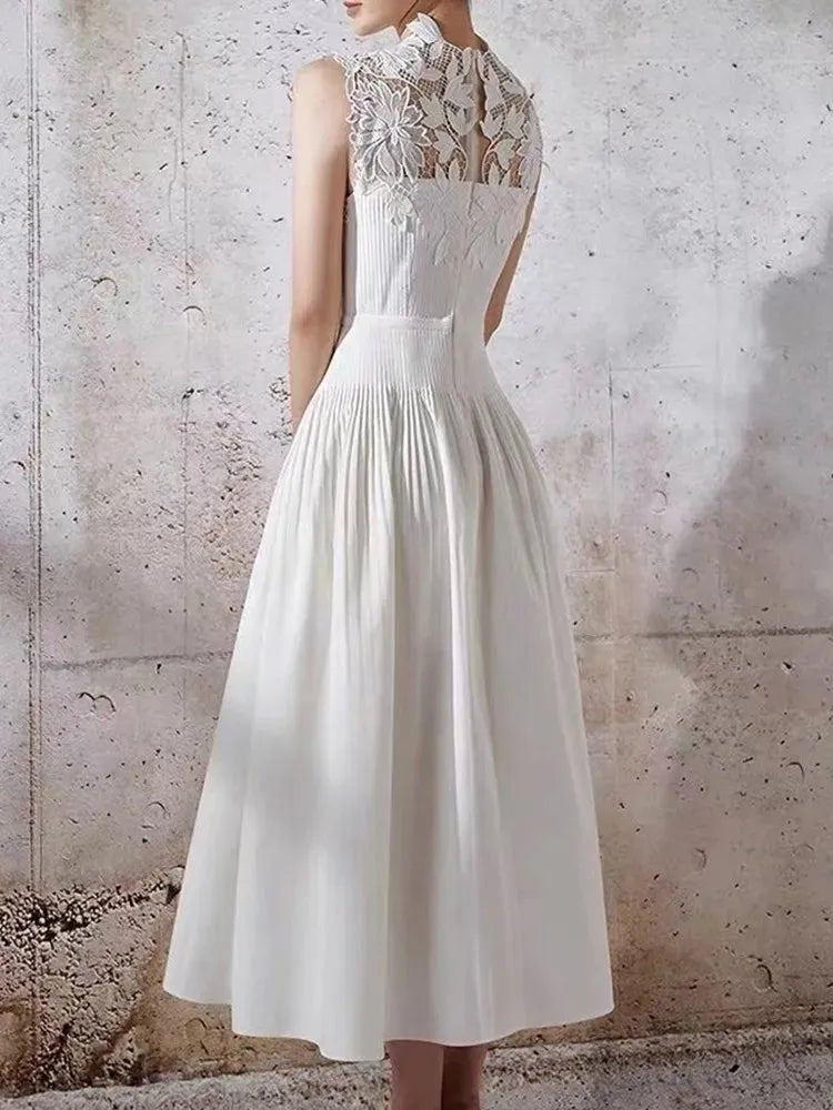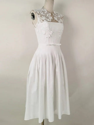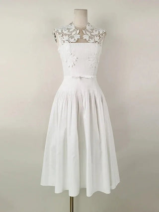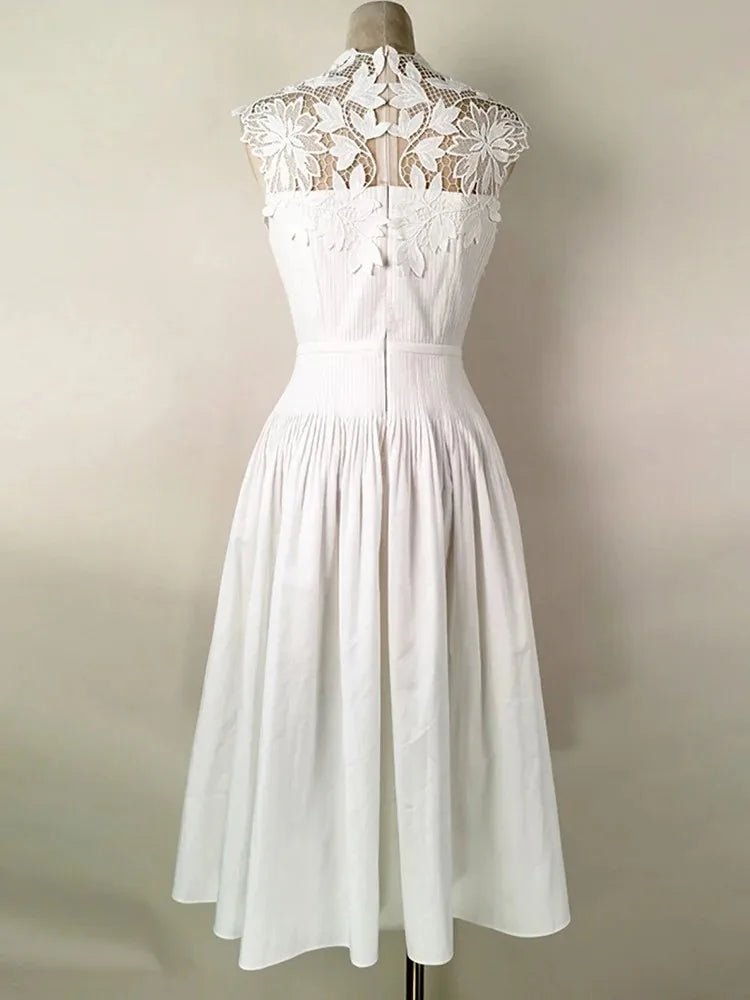 Design: A sleeveless high waist dress with a flattering V-neckline and delicate lace detailing, crafted in a knee-length A-line silhouette for an effortlessly elegant summer look.