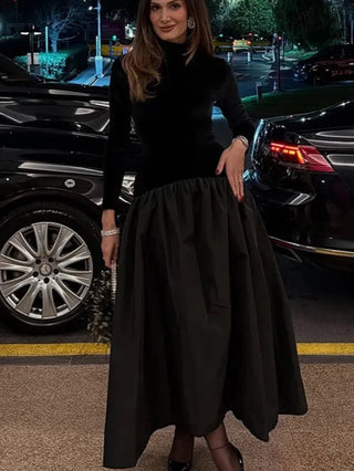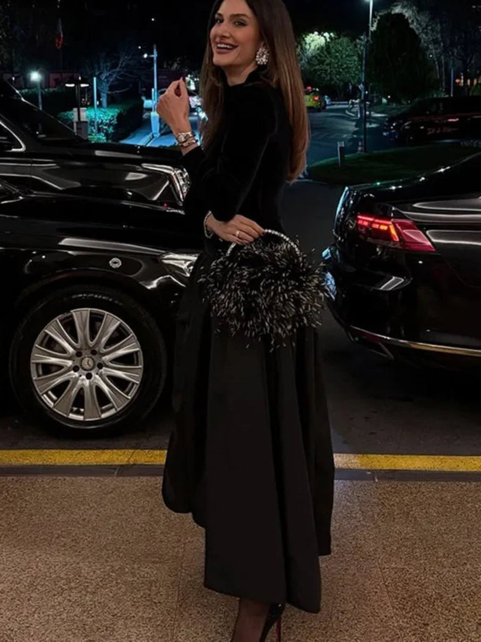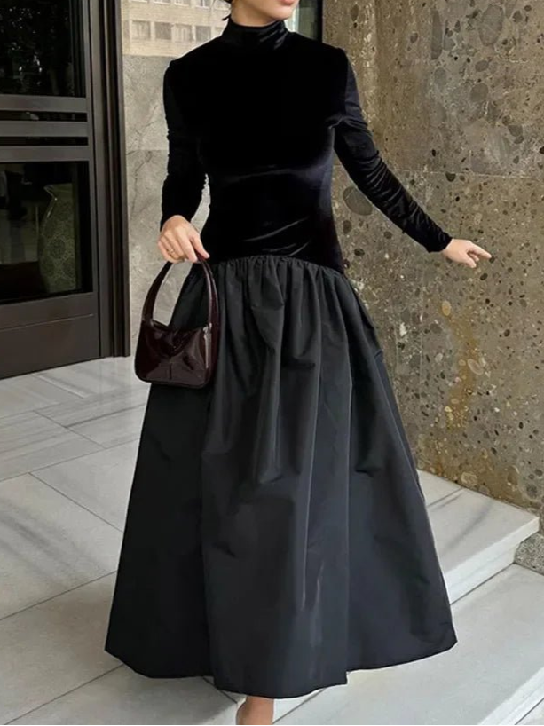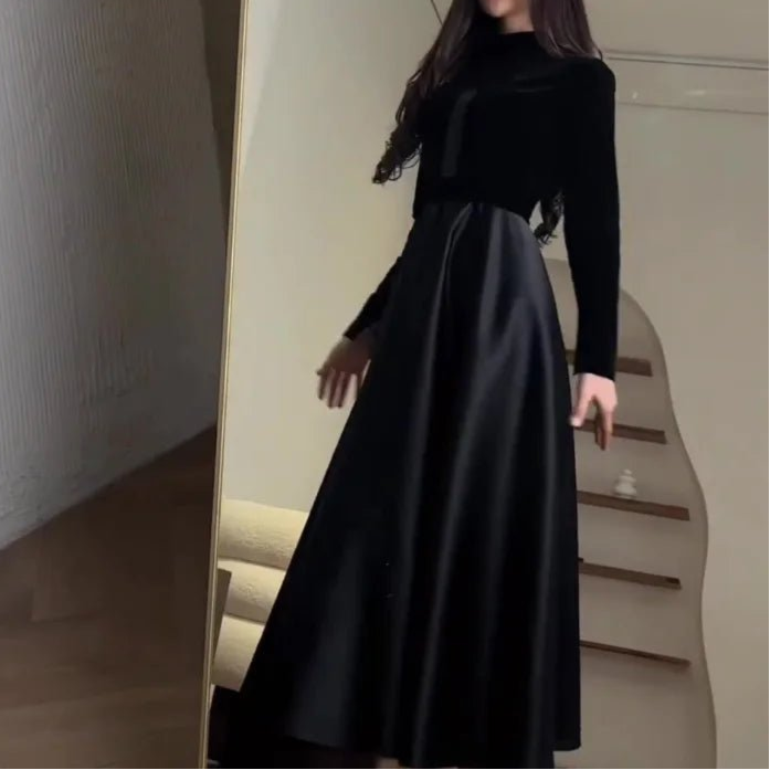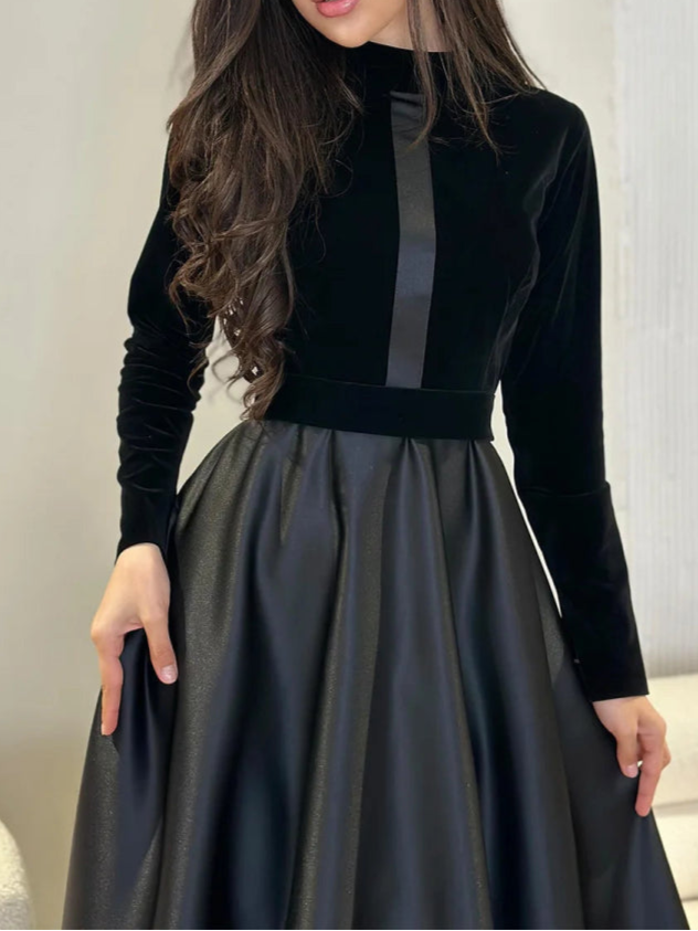 Design: An elegant black velvet pleated dress with a sleek, slim-fit silhouette. The mid-calf length and pleated hem provide a chic, sophisticated look, while the O-neckline and full sleeves complete the refined high street style.