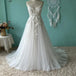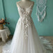Ethereal Illusion Wedding Gown featuring appliques, beading, and lace, BOHO style, V-neck, sleeveless, court train, floor-length, lace fabric, and backless design. Built-in bra, spaghetti straps, and natural waistline. Available in a luxury style with customizable options, perfect for an ethereal A-line silhouette.