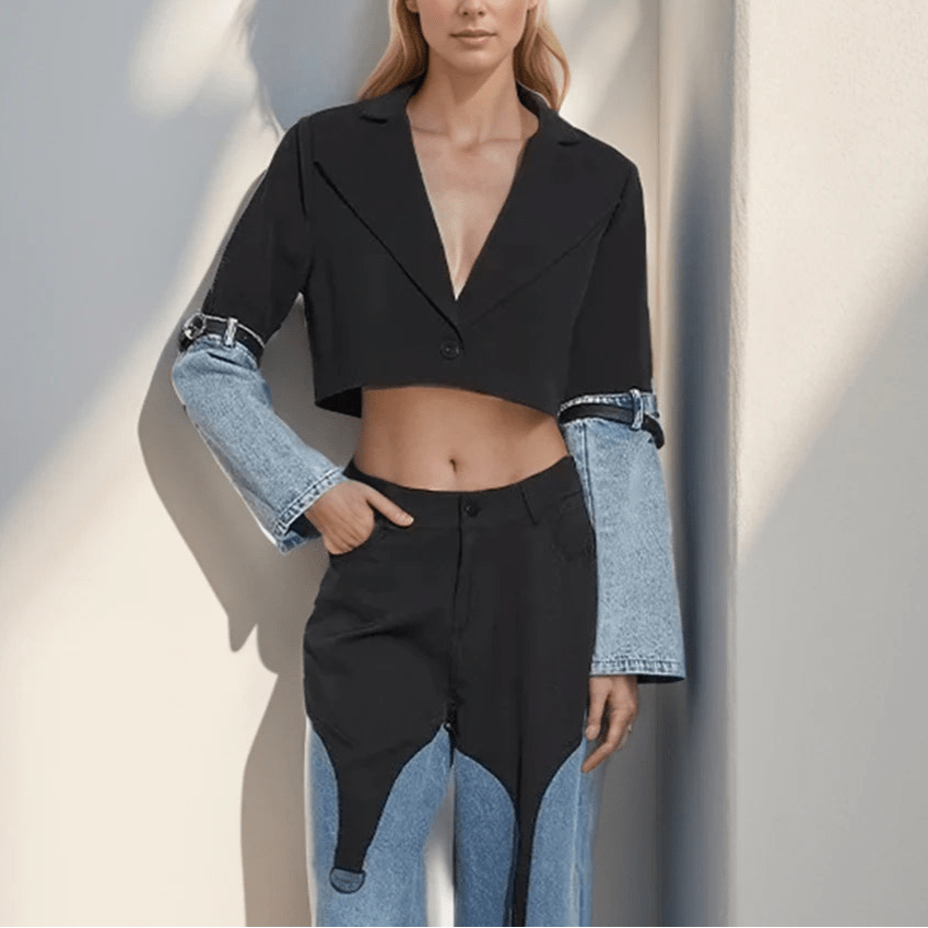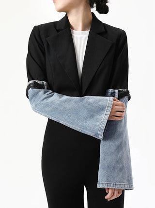 Design: A stylish patchwork denim jacket featuring a turn-down collar, single-button closure, and a slim fit. The modern silhouette and solid pattern create a chic and edgy streetwear look.