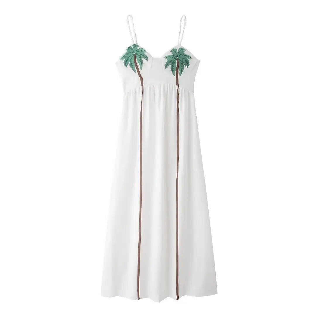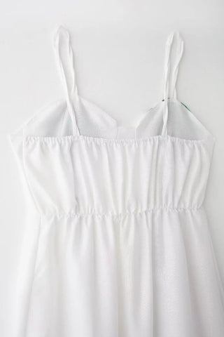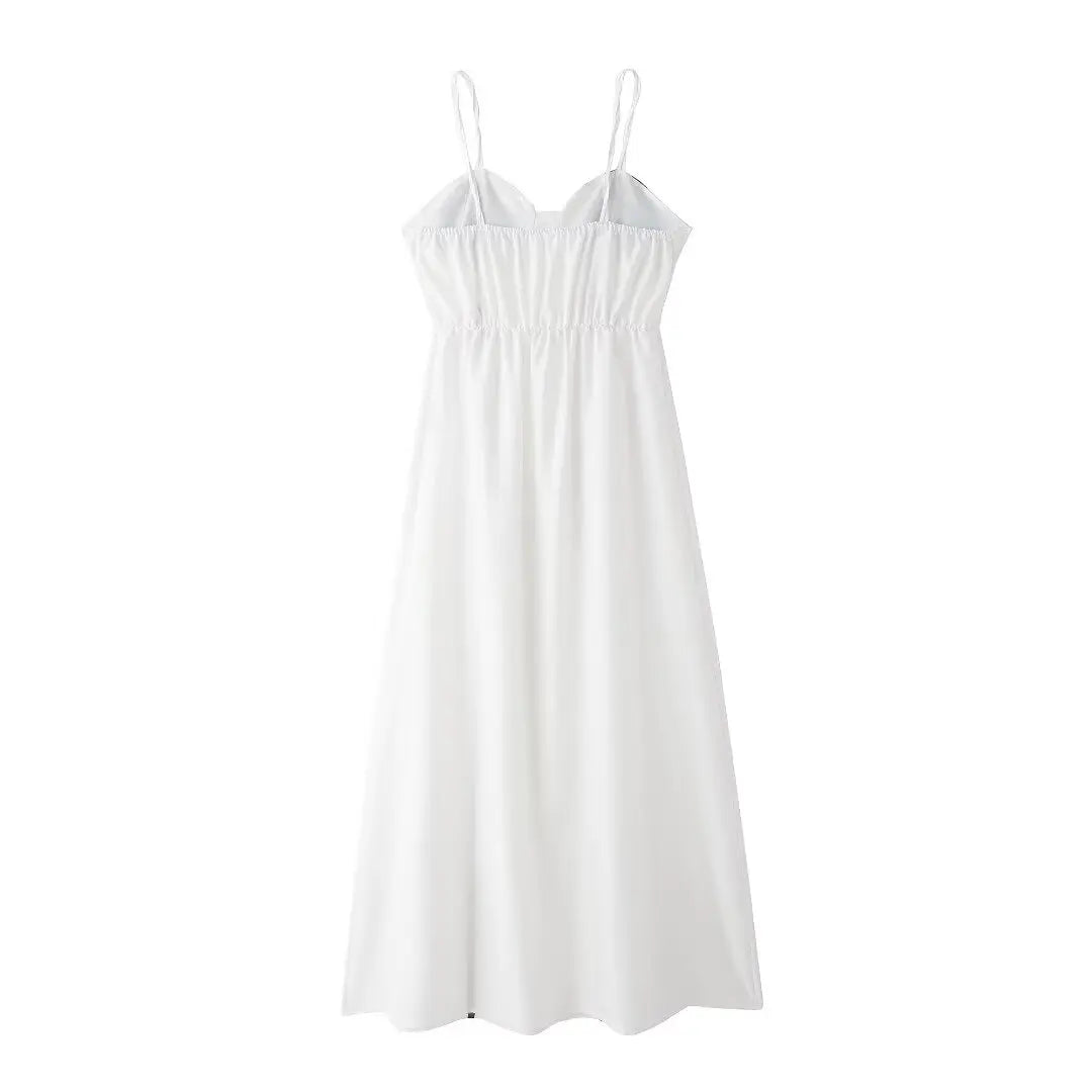 Design: A stylish ankle-length dress featuring a V-neckline, delicate spaghetti straps, and a backless design. The pleated silhouette enhances movement, creating a breezy and elegant holiday look.
