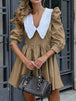 Design: A-line silhouette with a high-waist empire cut, pleated skirt, and modern patchwork details, creating a flattering and elegant look suitable for the office.