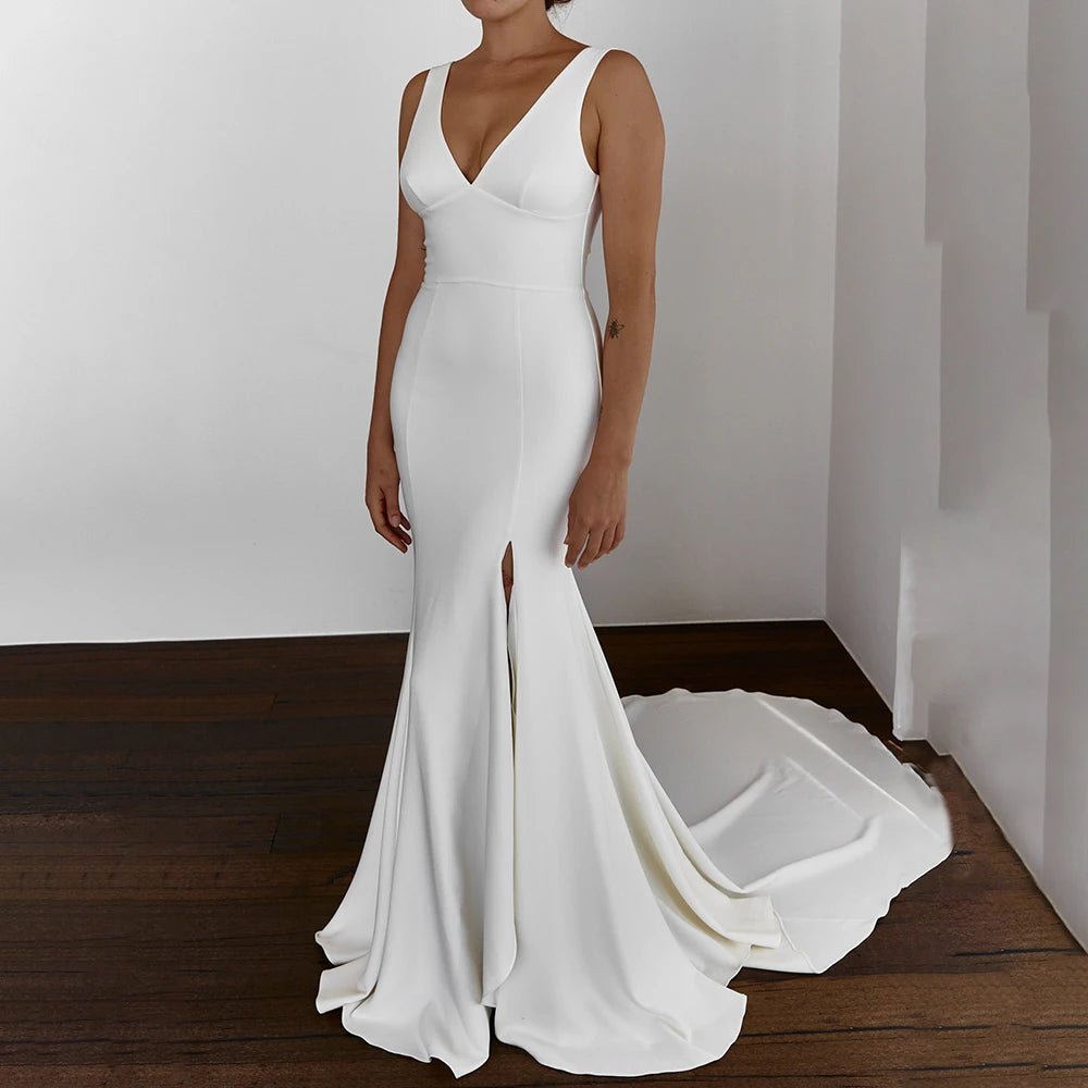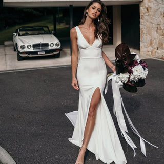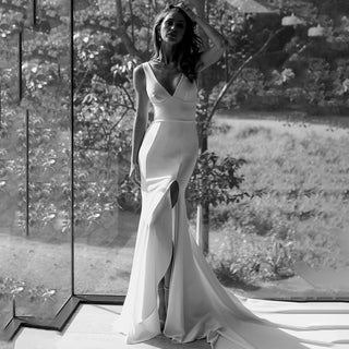 Fitted Crepe V-Neck Wedding Dress with High Split
