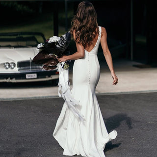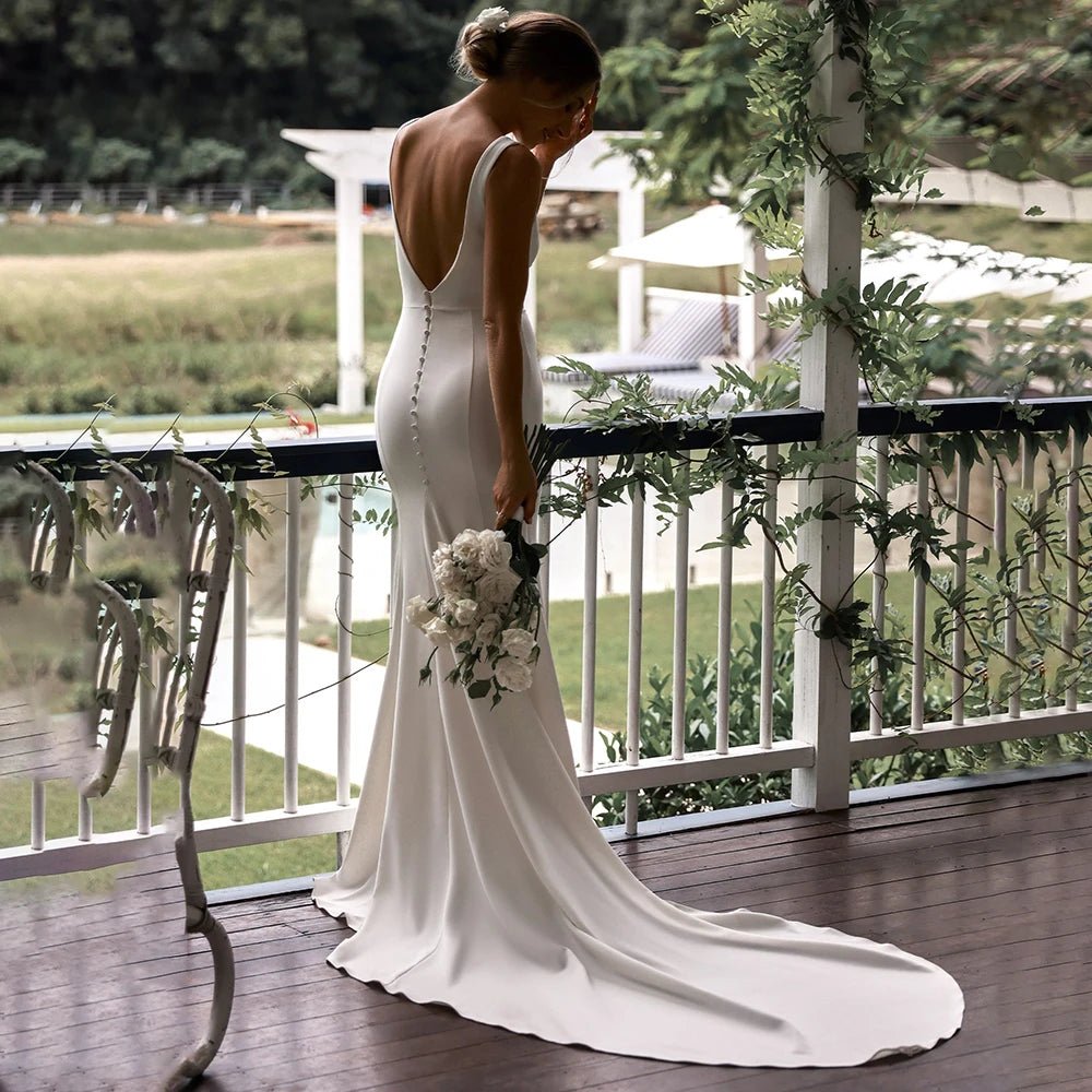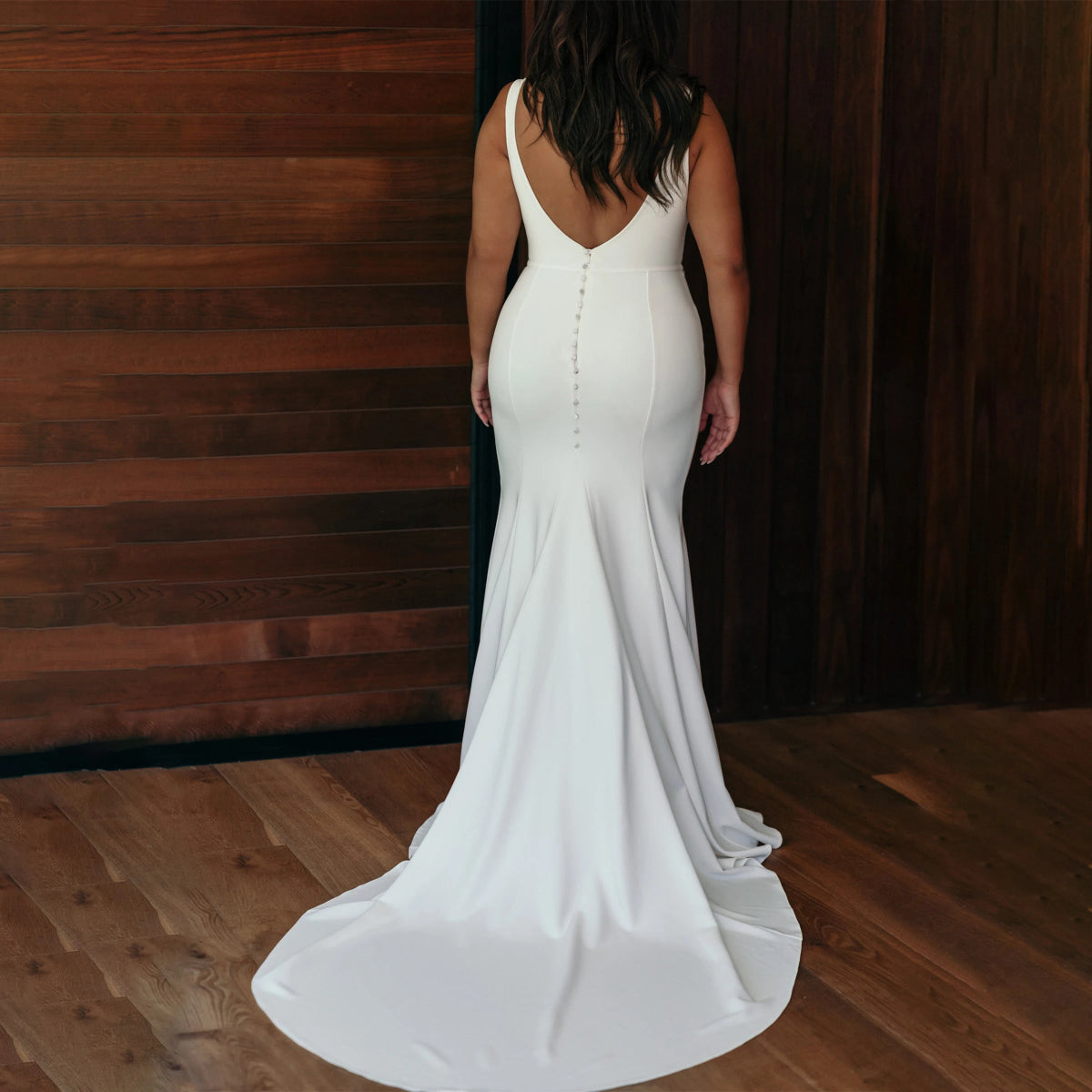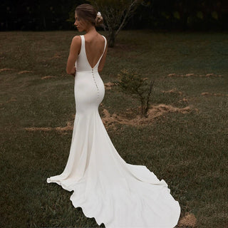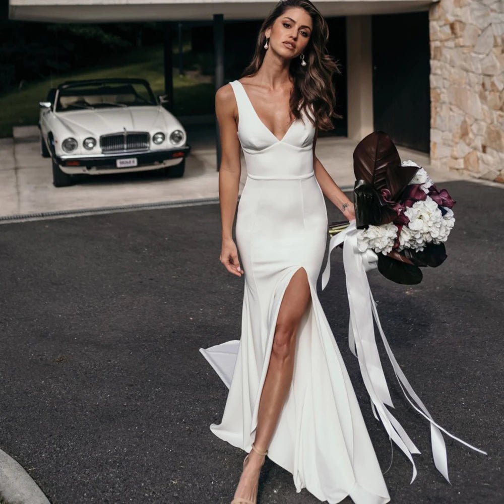 Elevate your bridal look with this fitted sheath wedding dress, featuring a plunging V-neckline and an alluring low-cut open back. Made from soft satin crepe, the gown includes a high split, button accents, and a sweep train for a flattering, feminine silhouette. Customizable and sleeveless, it comes with a built-in bra for a perfect fit, making it an elegant choice for your special day.