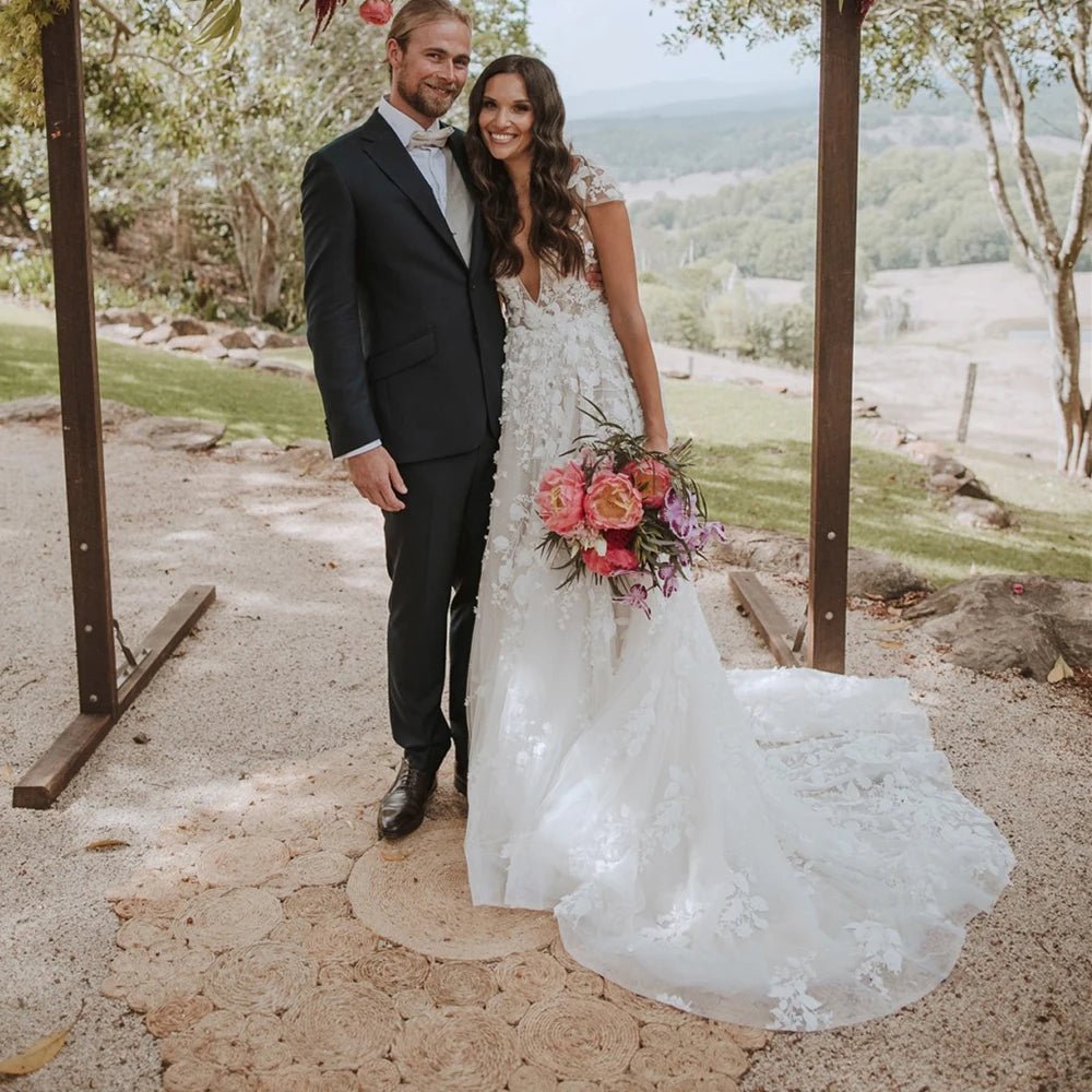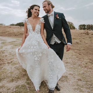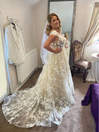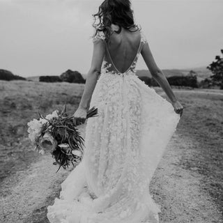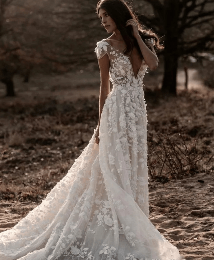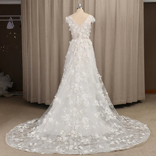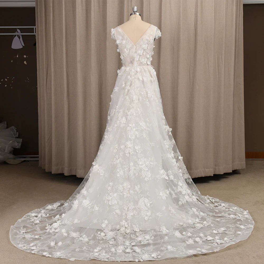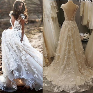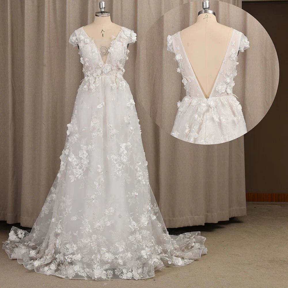 Design: This exquisite wedding dress features a flattering V-neckline and delicate cap sleeves, adding a touch of romance with its floral embroidered lace on net fabric. The sweeping brush train and backless design create a stunning silhouette, perfect for making a graceful statement on your special day.