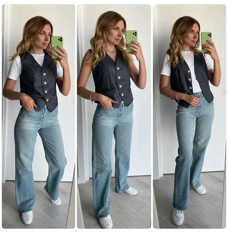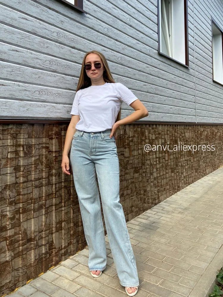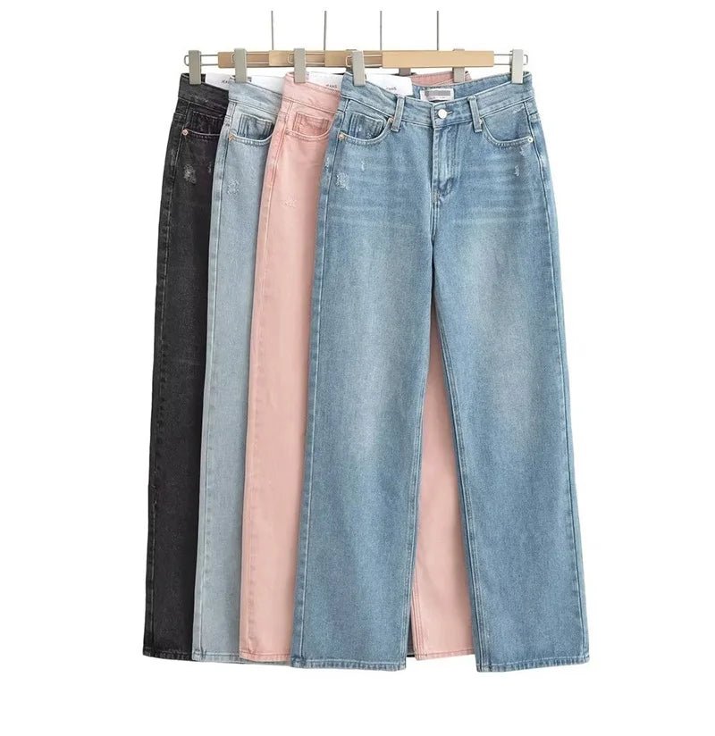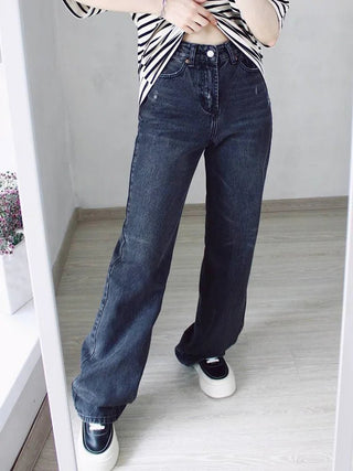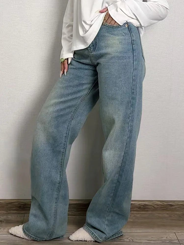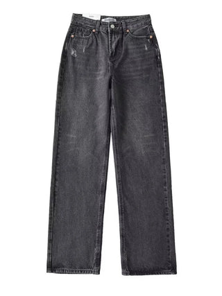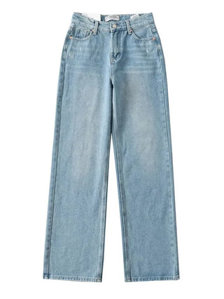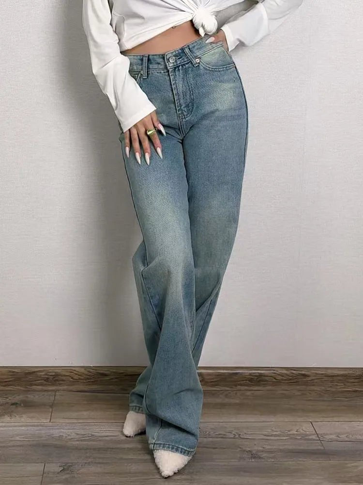 Design: Classic high-waist jeans with a straight leg silhouette, featuring a zipper fly closure, bleached detailing, and a relaxed, loose fit. The vintage-inspired wash adds an effortless edge to casual looks.