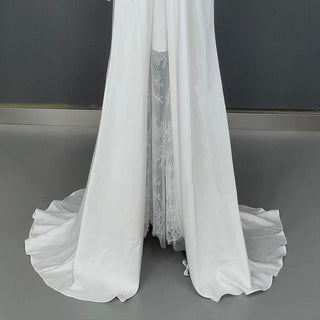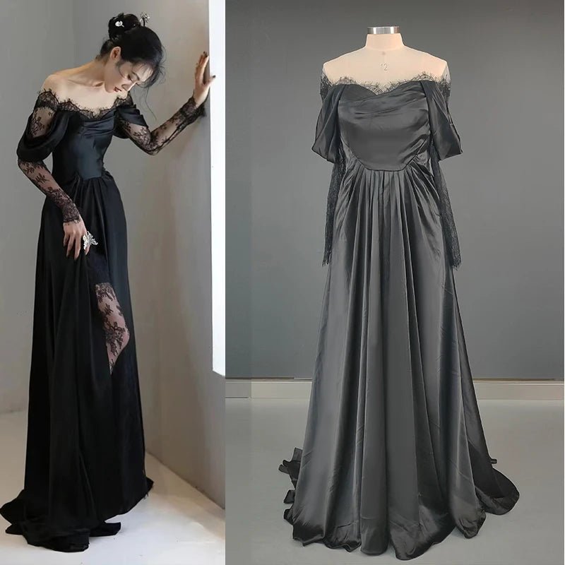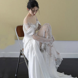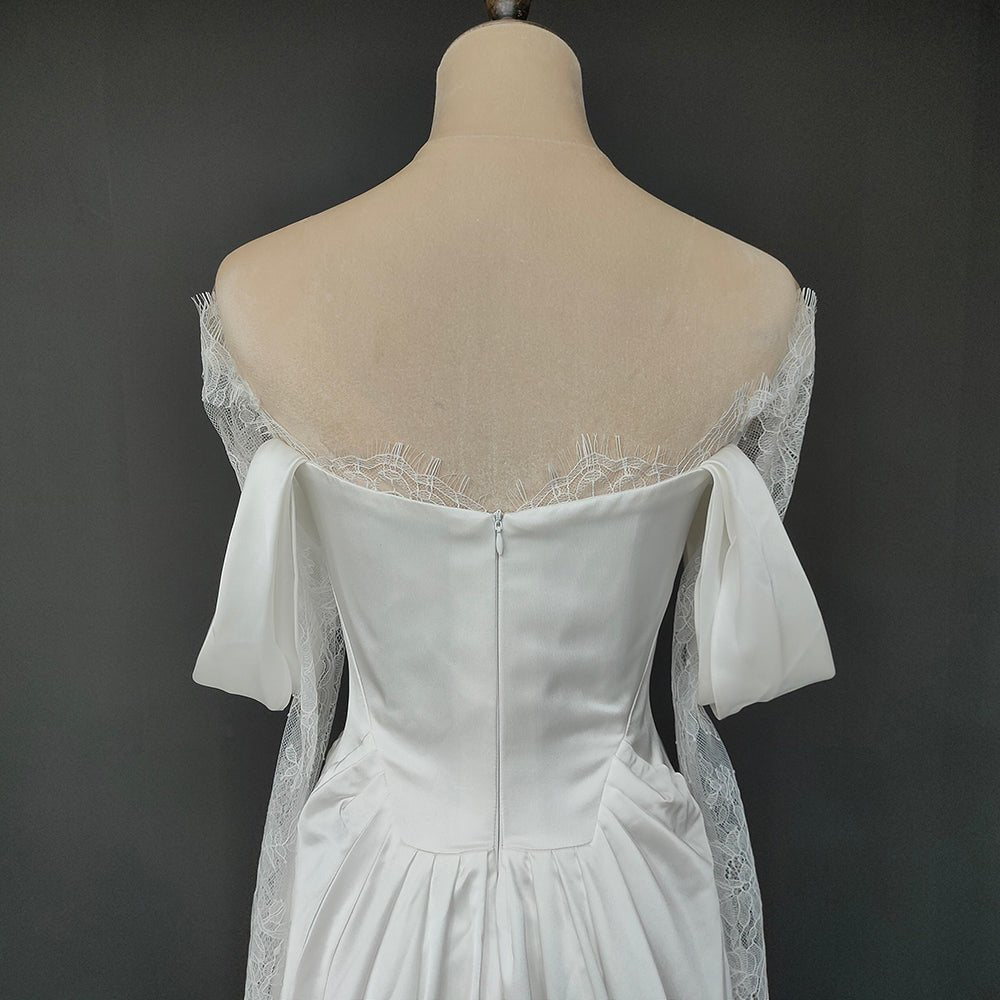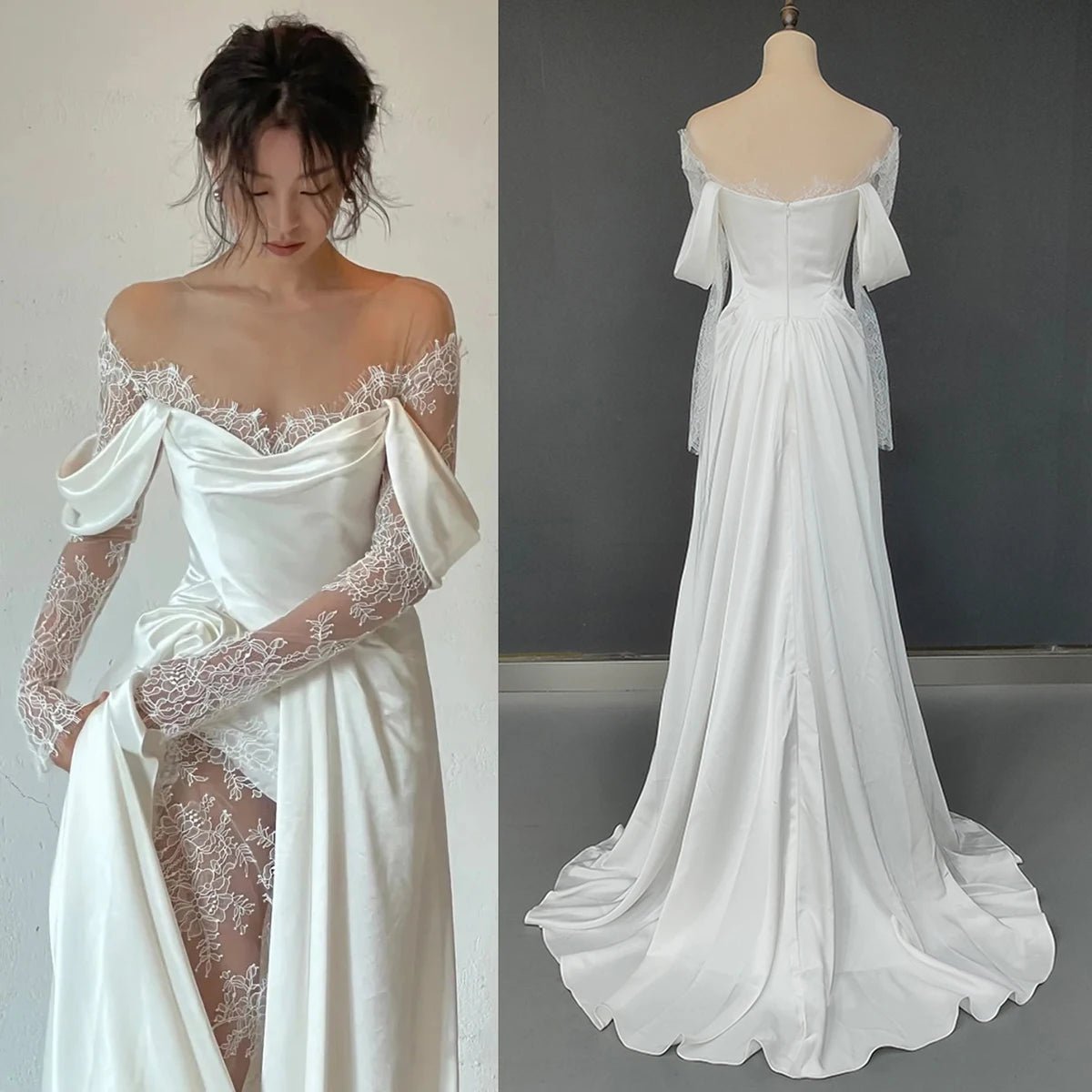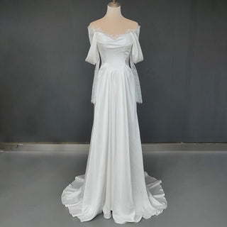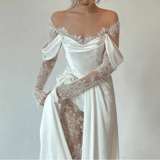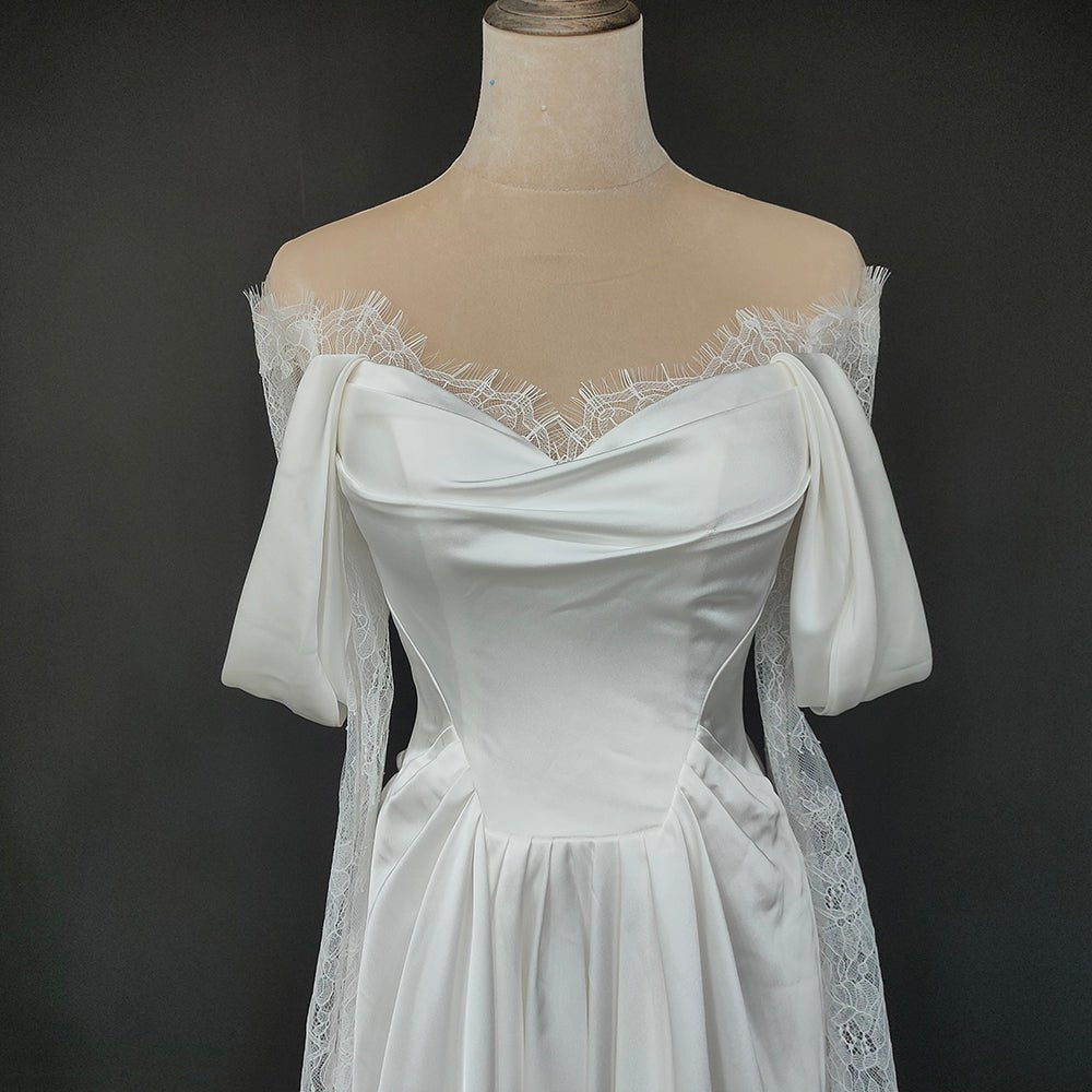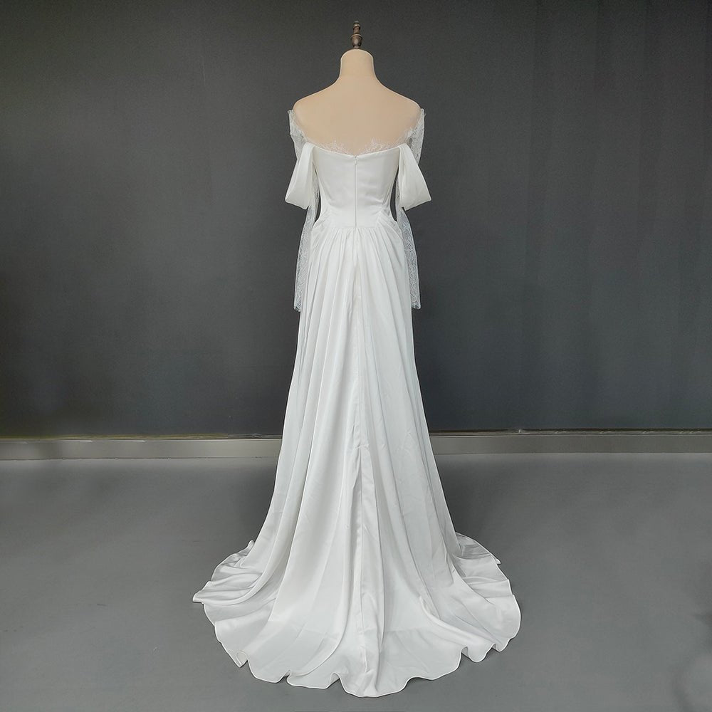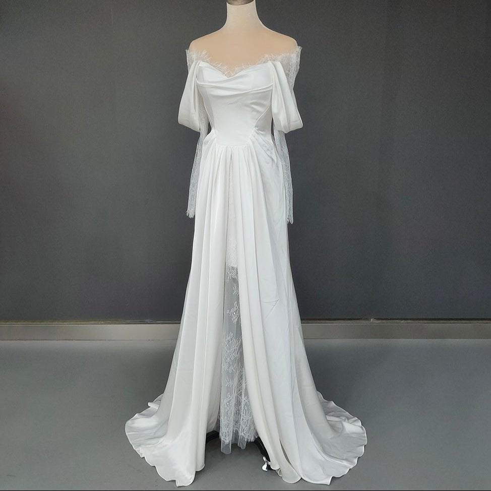 Design: A timeless off-shoulder bridal gown featuring a boat neckline, long sleeves, and an A-line silhouette. Crafted in satin with lace and ruched details, it includes a dramatic high slit for modern elegance.