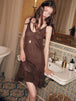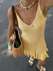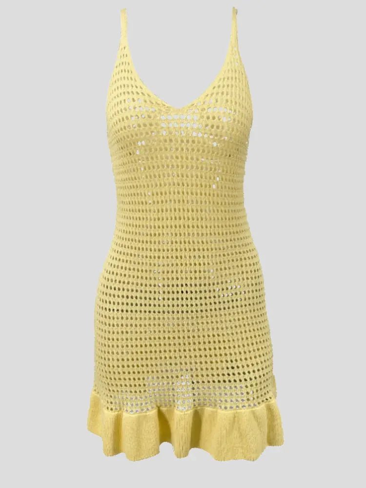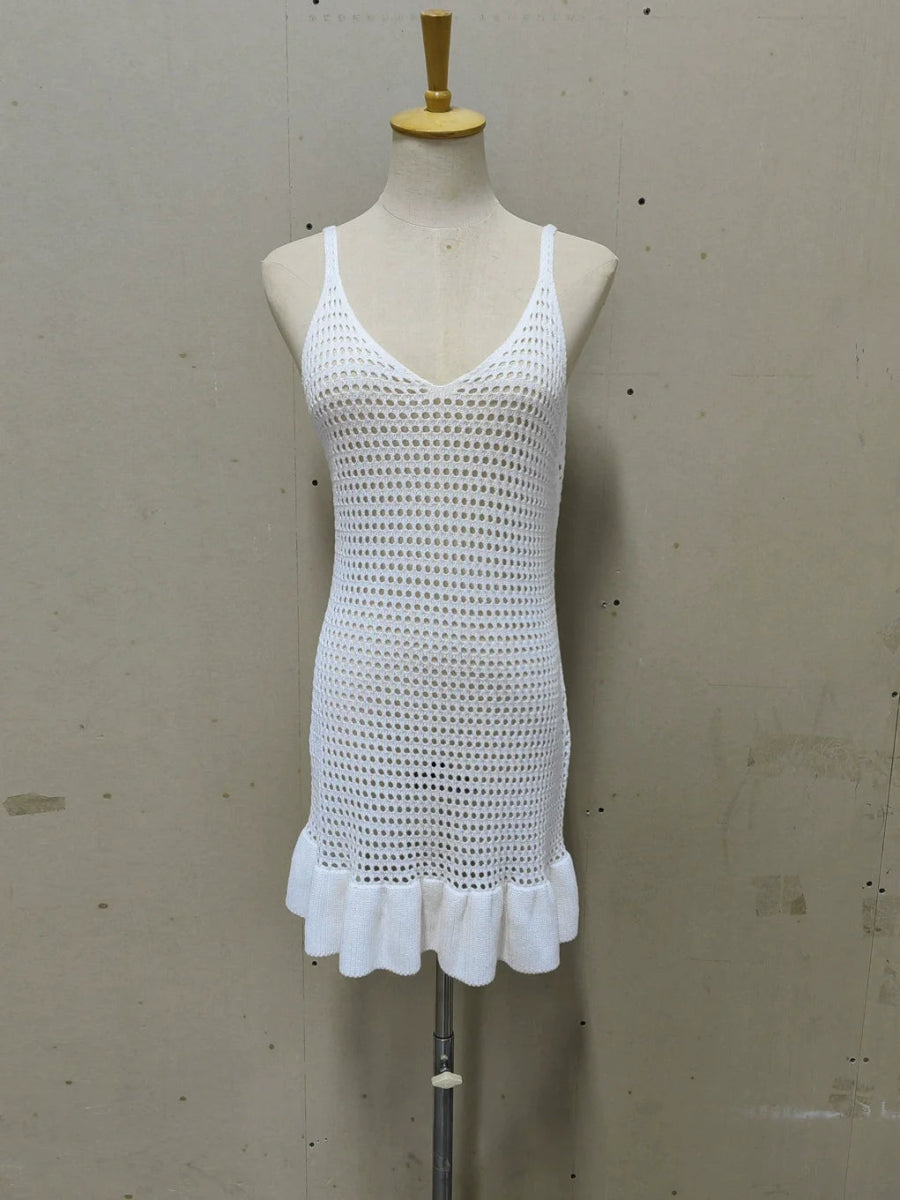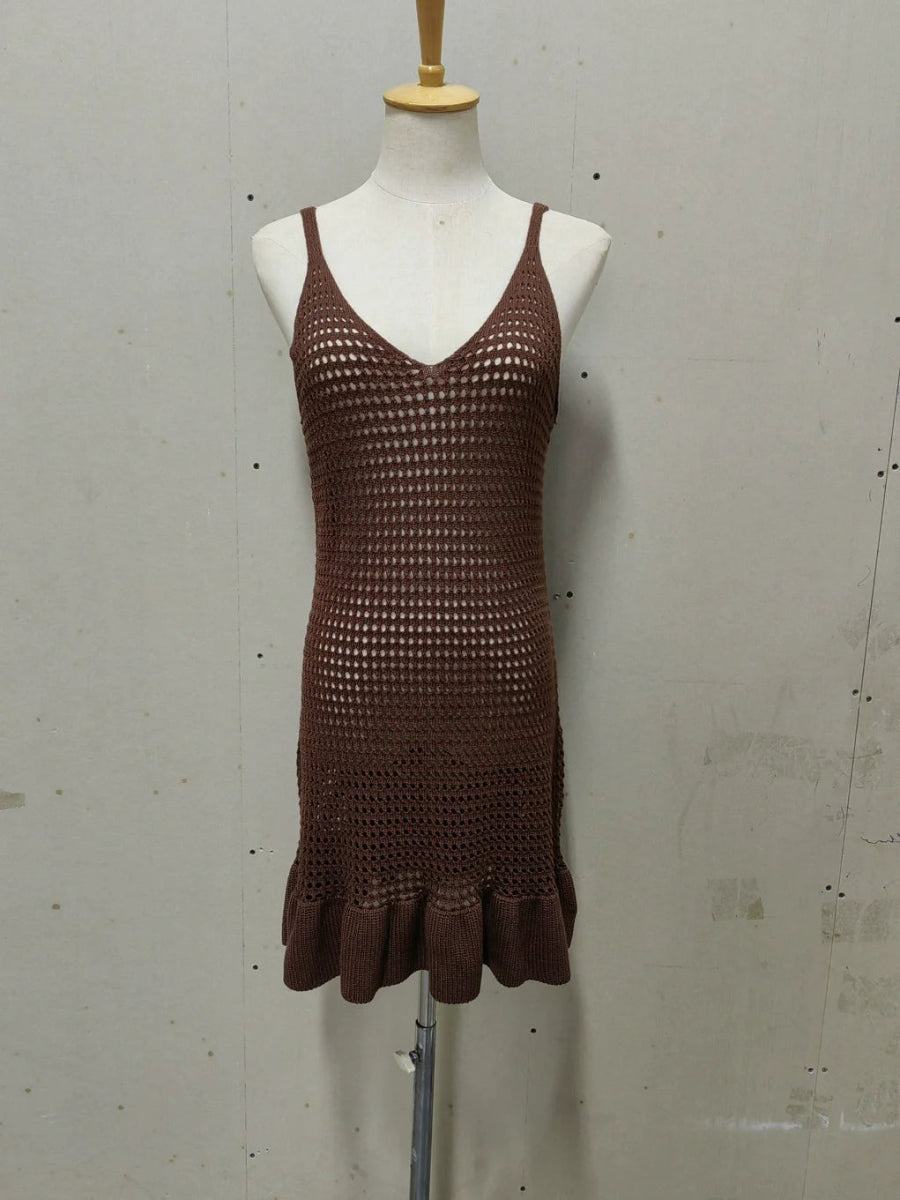 Design: A flirty knit mini dress featuring a see-through construction, delicate ruffled edges, and a flattering V-neckline. Its slim, body-hugging silhouette adds effortless charm, perfect for casual chic looks.