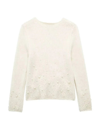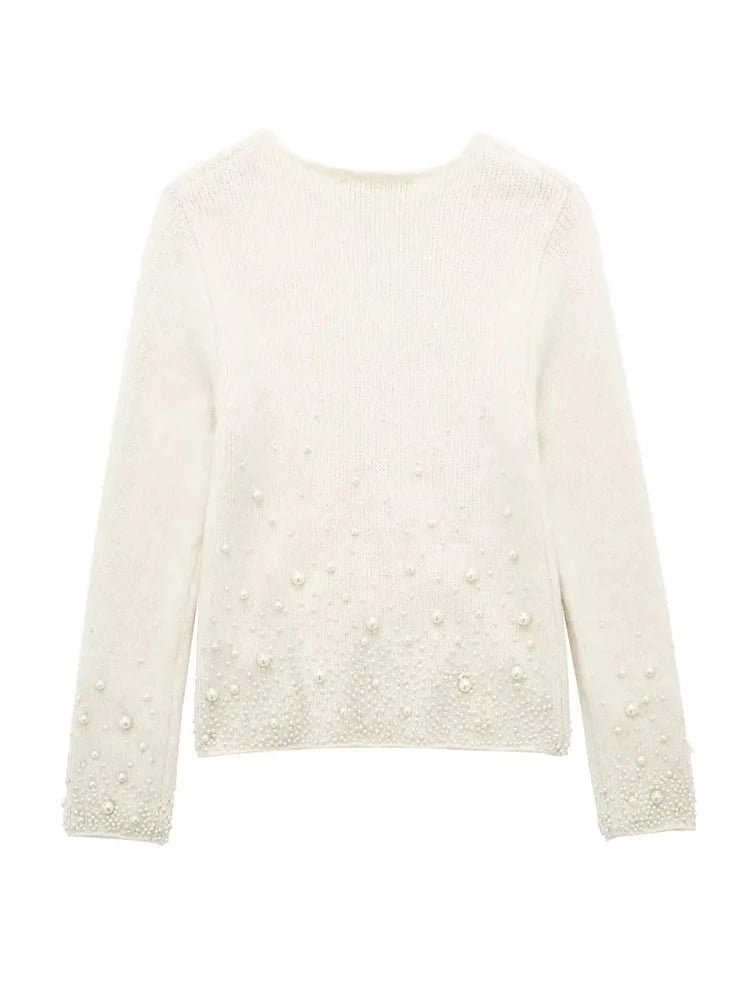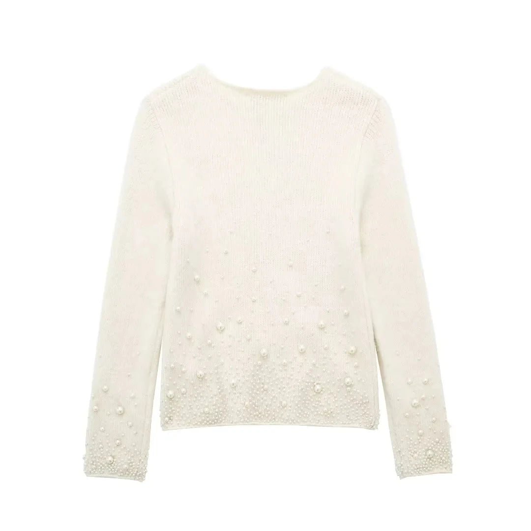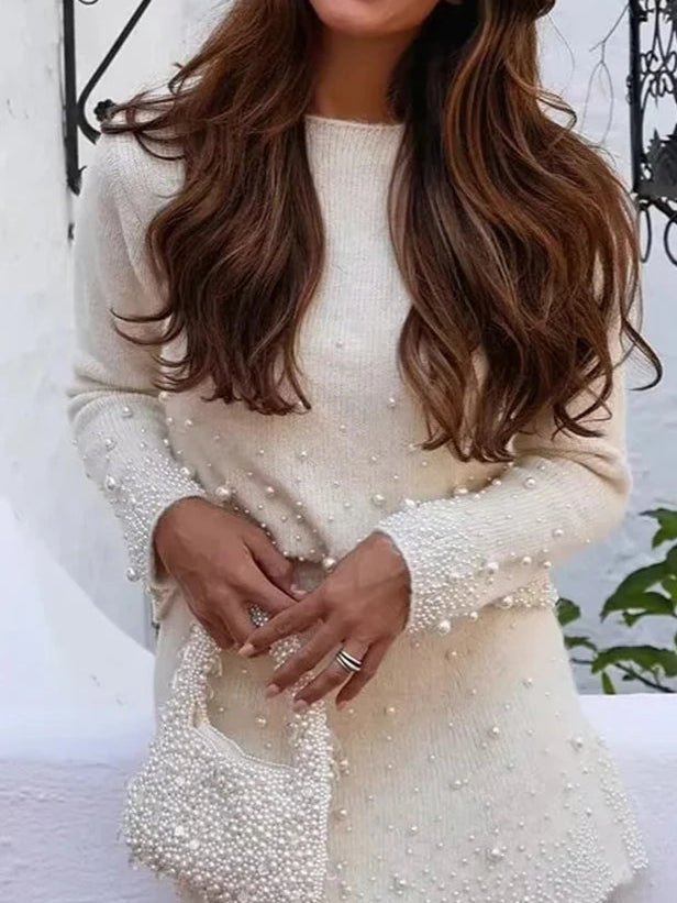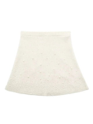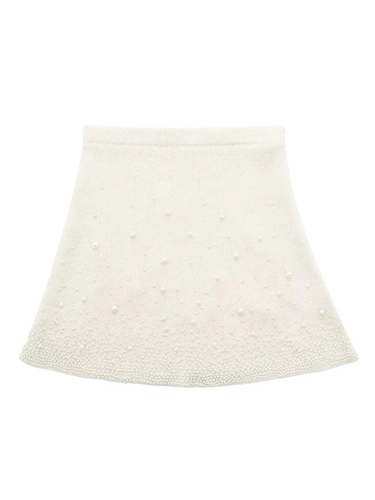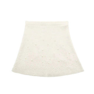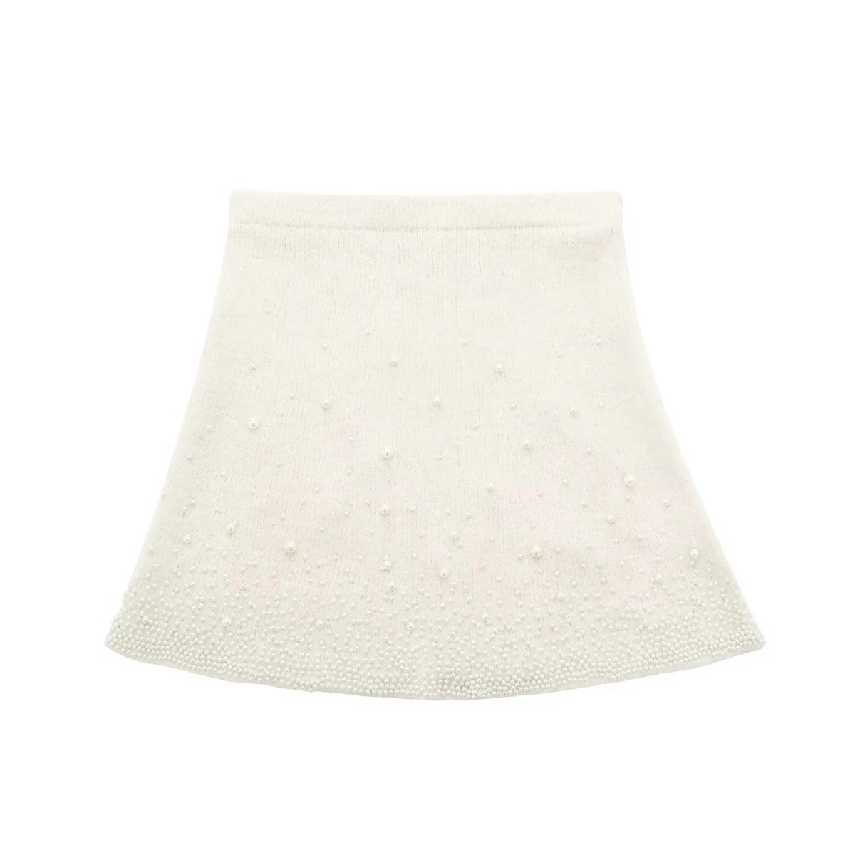 Design: A vintage-inspired knitted sweater and high-waist skirt set adorned with delicate pearl embellishments. The sweater features a cozy O-neck and full-length sleeves, while the A-line skirt offers a flattering silhouette with an elastic waistband for a comfortable fit.