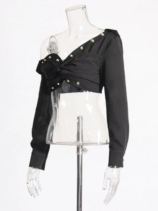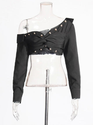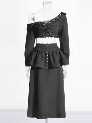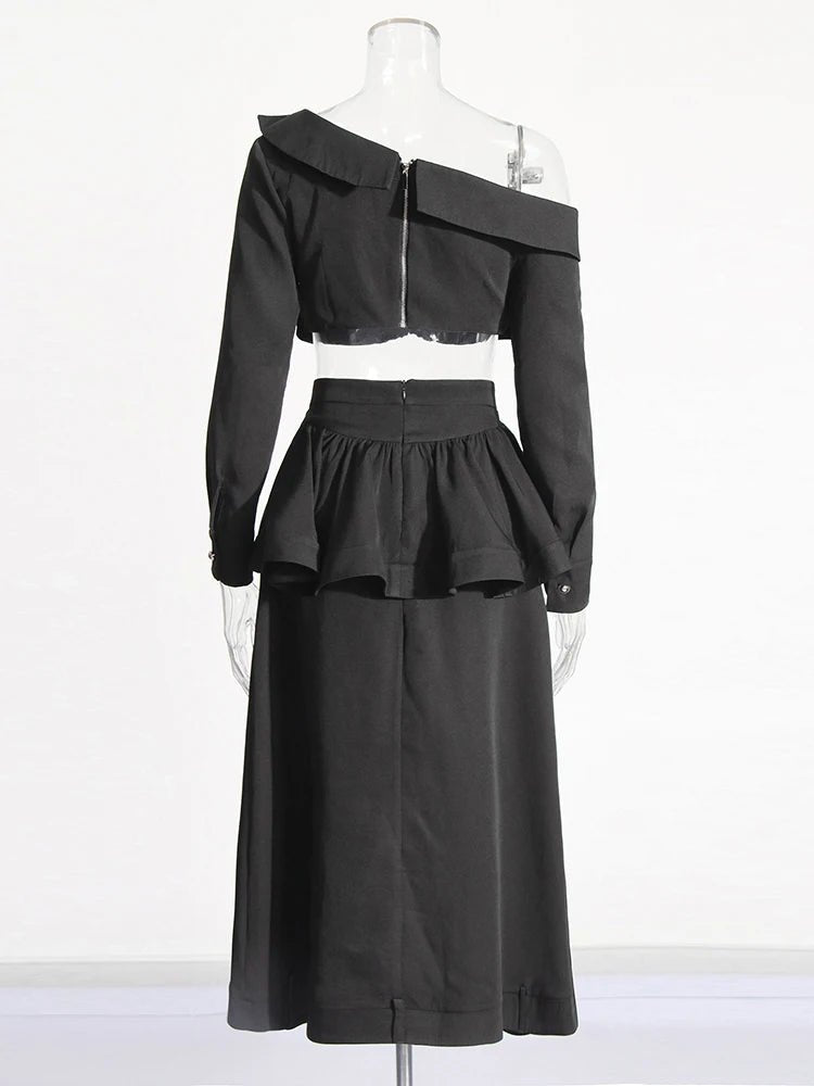 Design: A sophisticated two-piece set featuring a long-sleeve ruched top with a chic slash neckline and an ankle-length A-line skirt. The loose-fit top balances the structured silhouette of the skirt for an elegant yet effortless look.