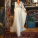 Boho chiffon bridal gown with a V-neckline and full puff sleeves. This A-line silhouette features a vintage-inspired design with lace details, a sweep train, and a floor-length skirt. The back is finished with a zipper closure, and the gown includes a built-in bra. Customizable with a natural waistline for a timeless bridal look.