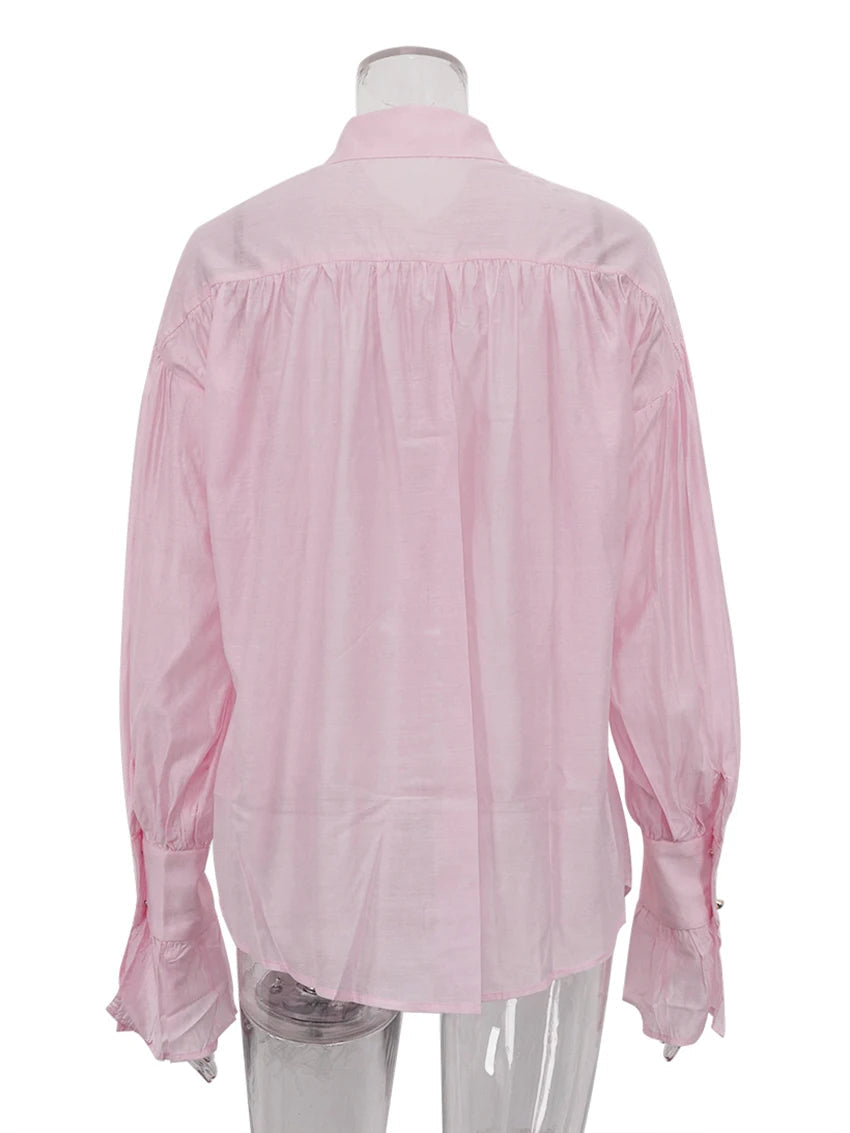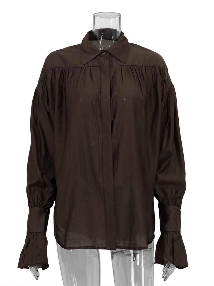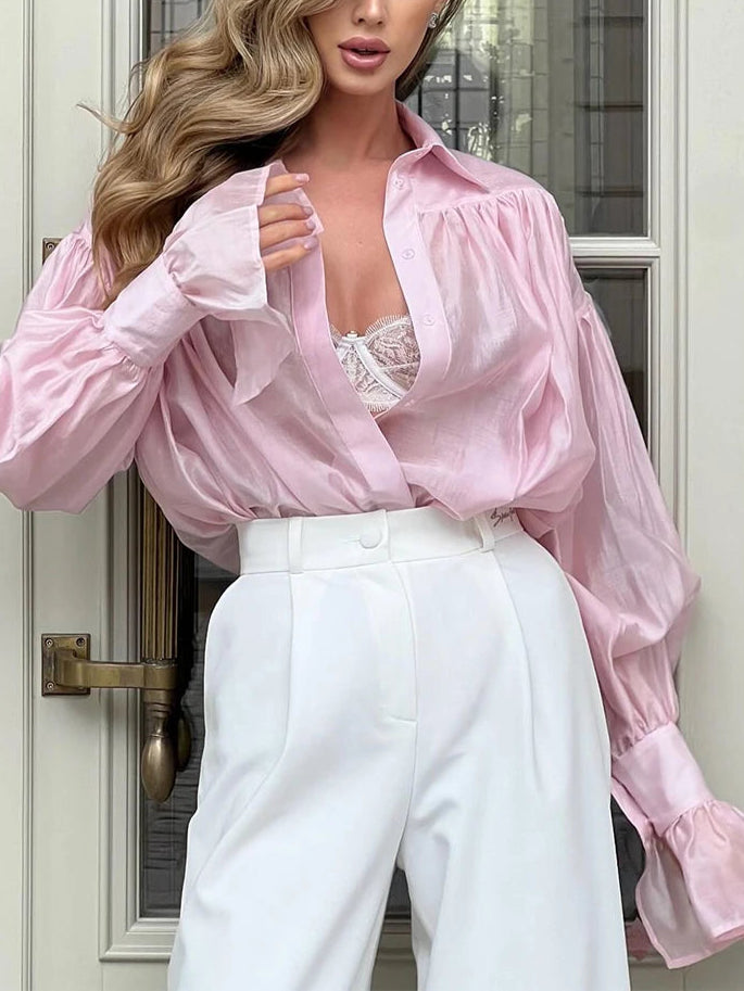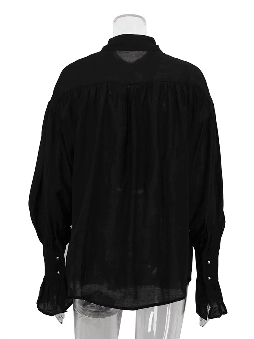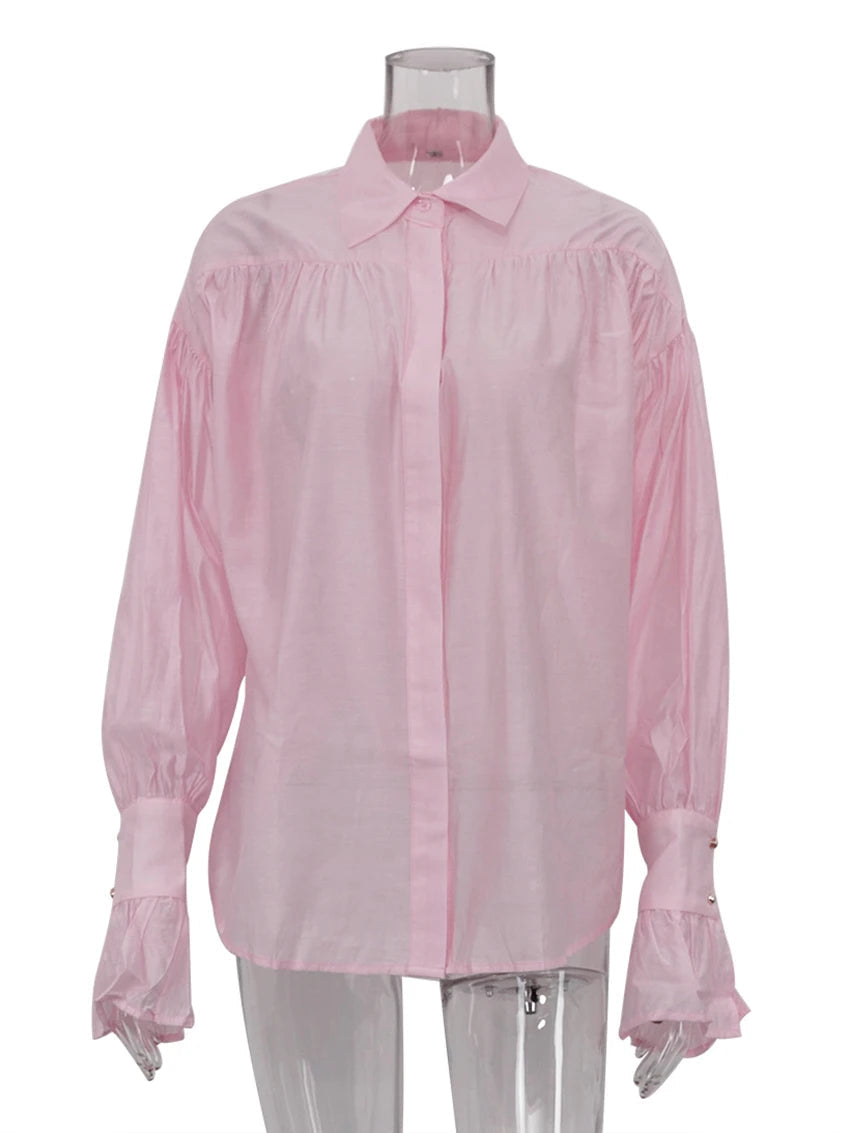 Design: A sophisticated long-sleeve blouse featuring a turn-down collar and a single-breasted closure. The loose fit and woven fabric create an effortlessly polished look, perfect for office wear.