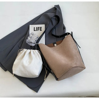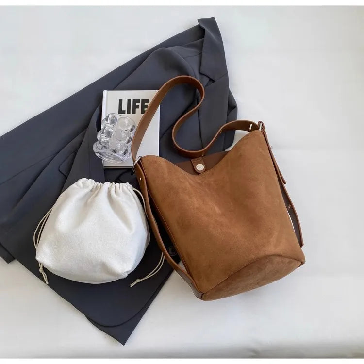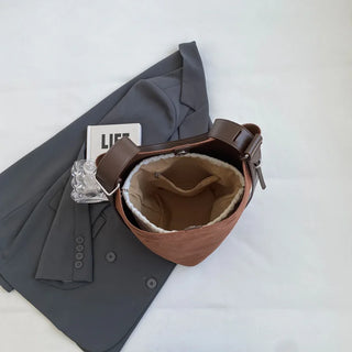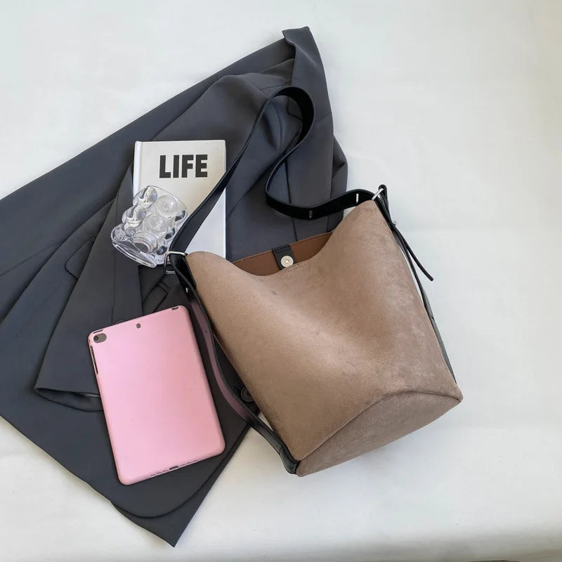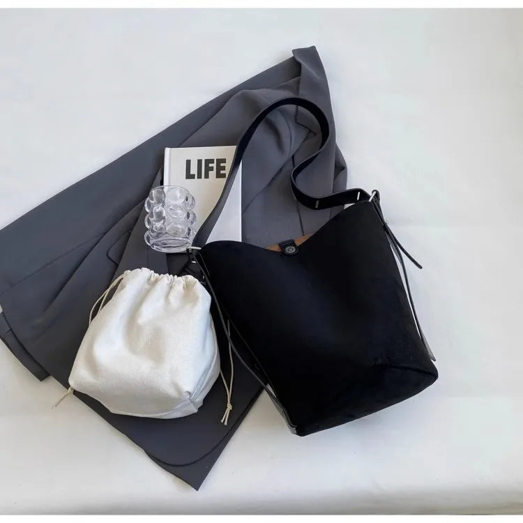 Design: A modern bucket bag featuring a sleek matte finish, a soft yet structured silhouette, and a wide shoulder strap for added comfort. The minimalist aesthetic offers effortless sophistication.