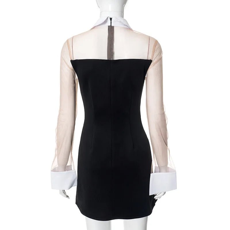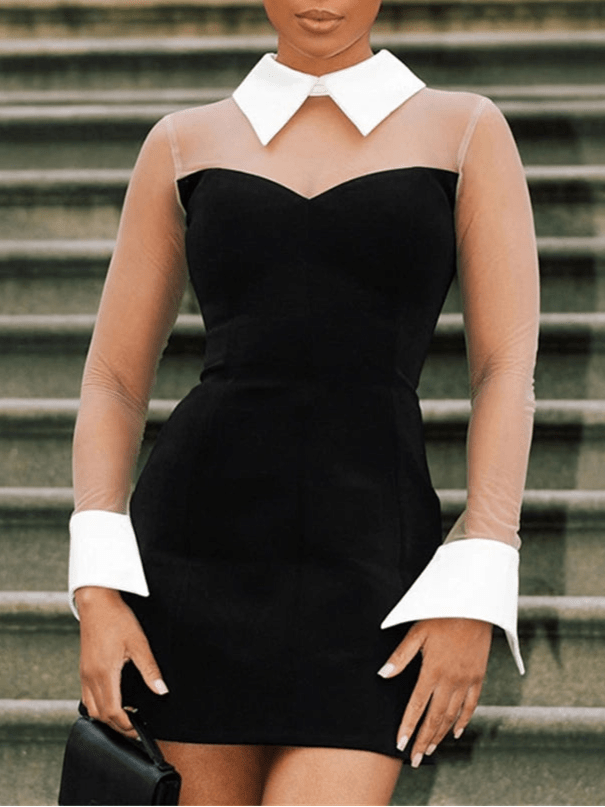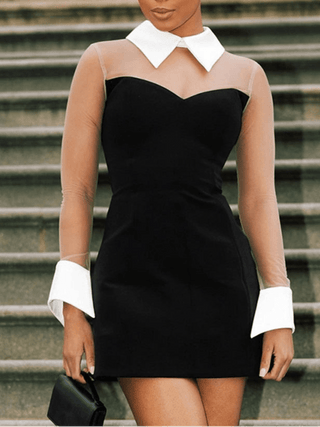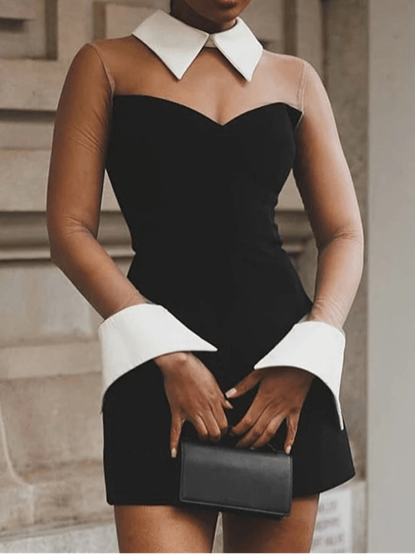 Design: A chic and daring mini dress with a sophisticated turn-down collar, offering a modern yet timeless look. The see-through mesh detailing adds a touch of allure, while the slim fit and empire waistline accentuate your figure beautifully.