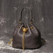 Design: A vintage-inspired bucket bag featuring a sleek metal drawstring closure, an elegant chain strap, and a compact yet spacious silhouette. The timeless design blends sophistication with everyday practicality.
