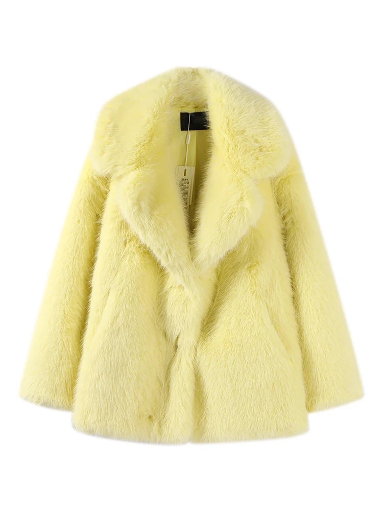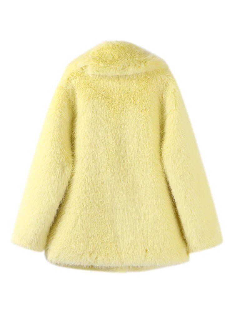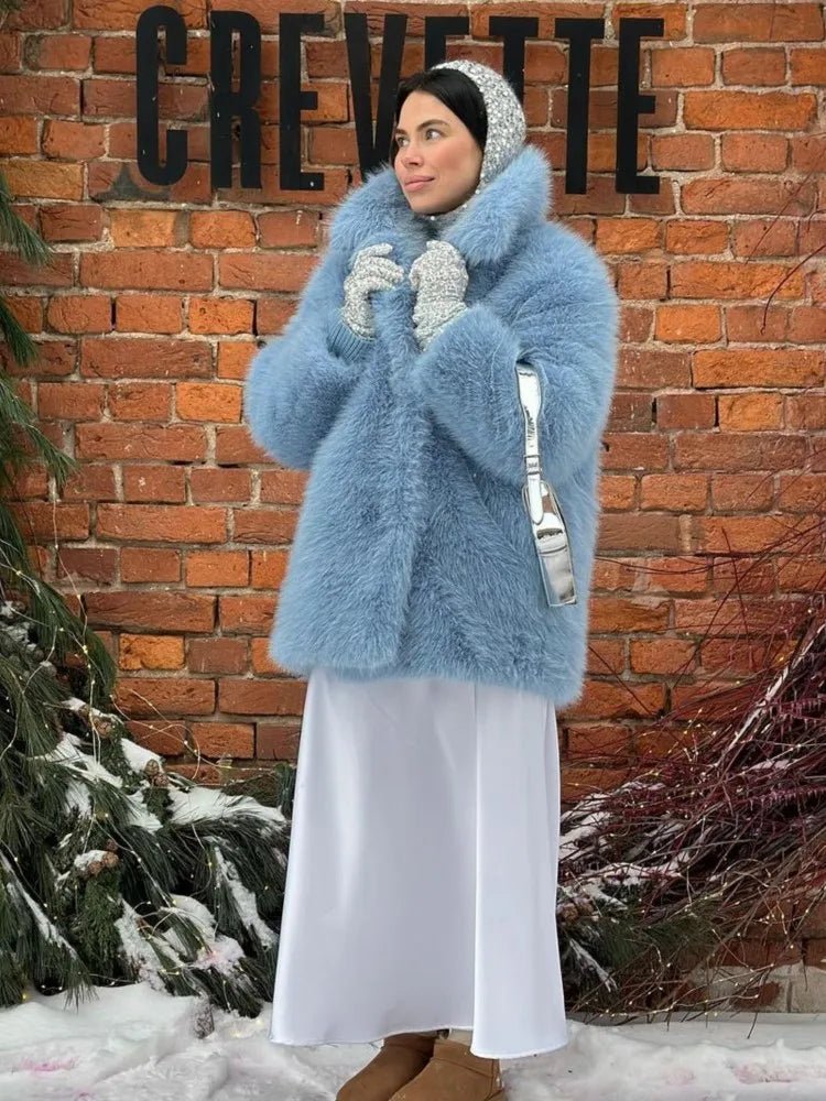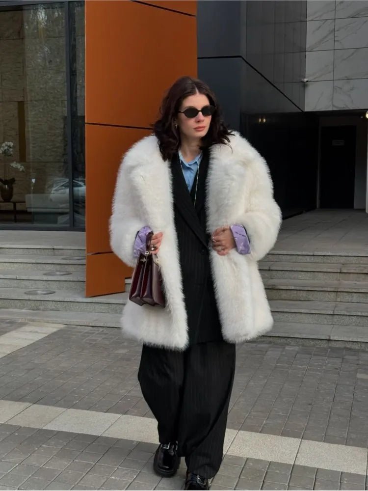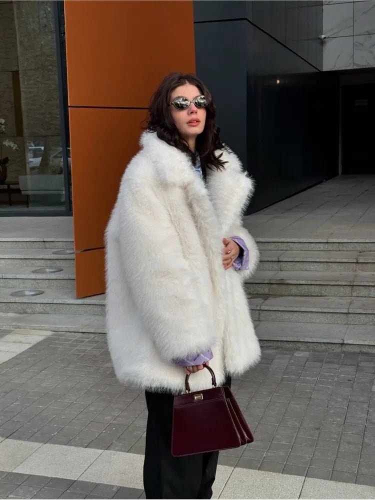 Design: Mid-length imitation fox fur coat with a suit collar, loose fit, open-stitch closure, and full-length sleeves. Soft double-faced faux fur adds warmth and casual sophistication.