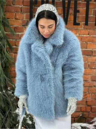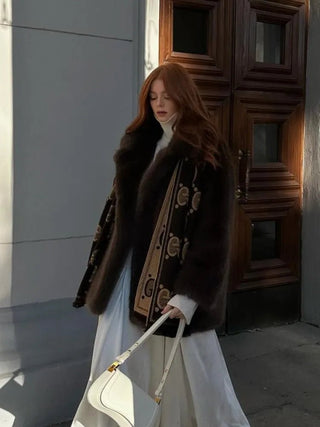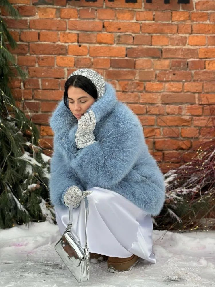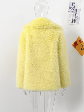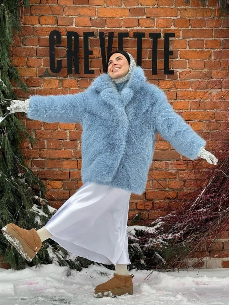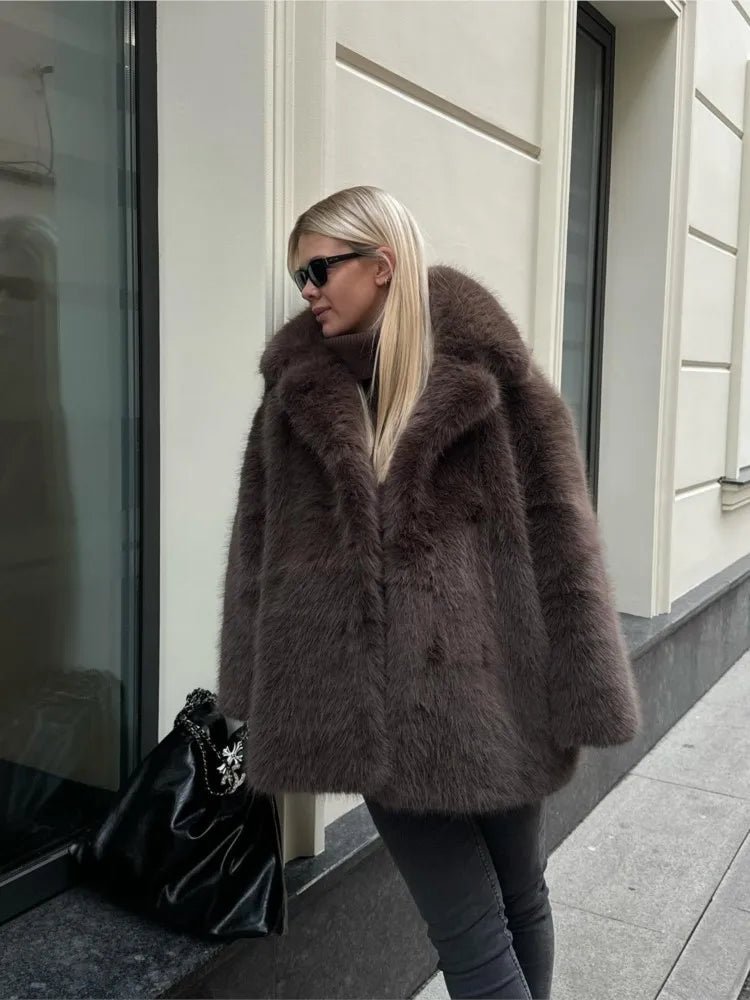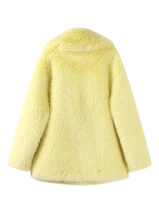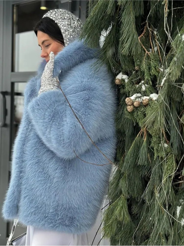 Design: Mid-length imitation fox fur coat with a suit collar, loose fit, open-stitch closure, and full-length sleeves. Soft double-faced faux fur adds warmth and casual sophistication.