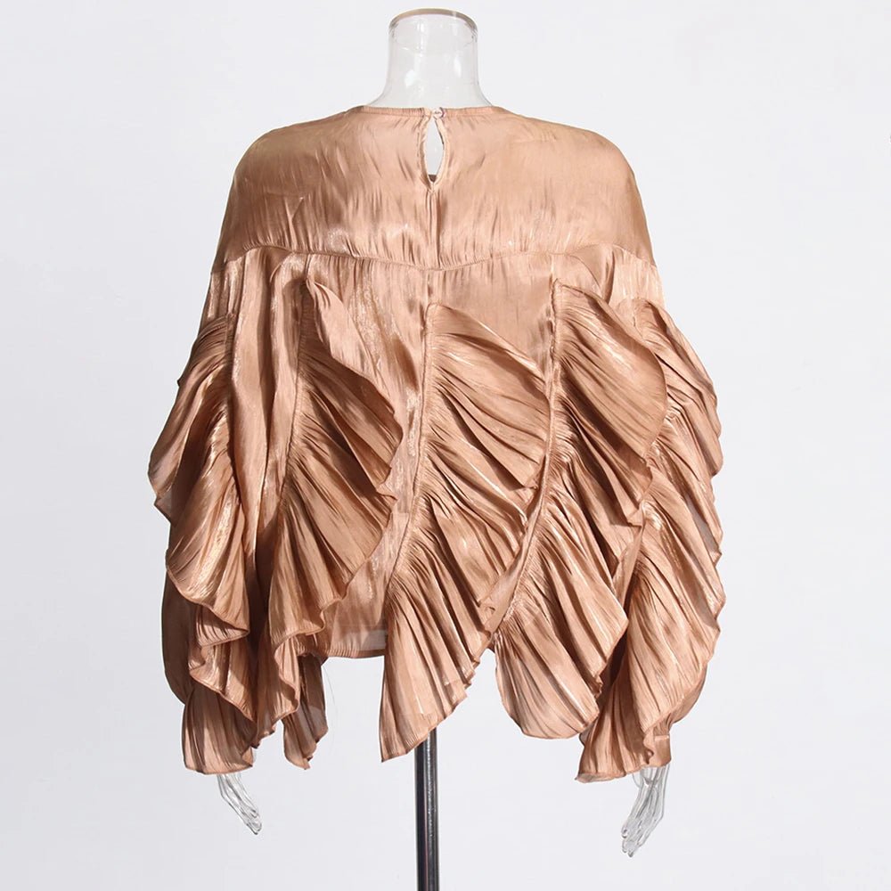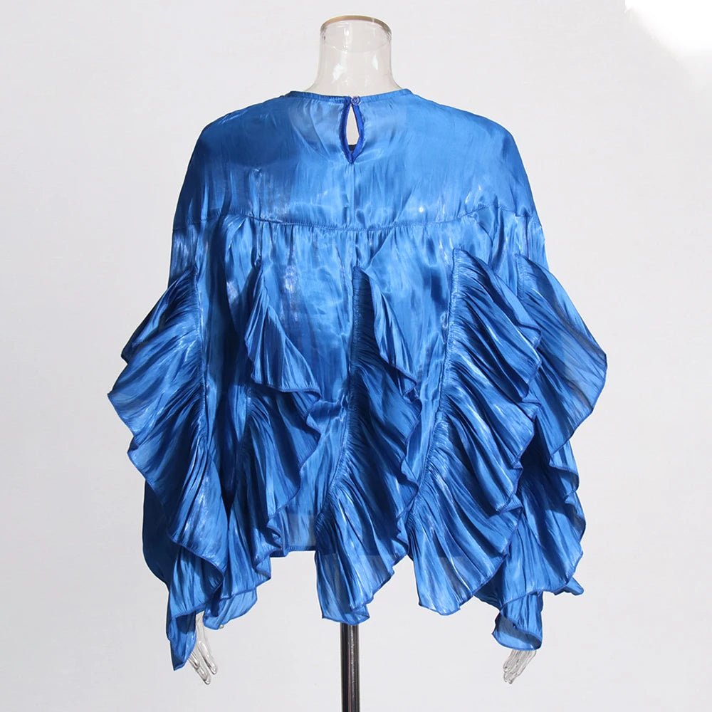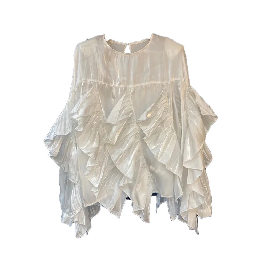Design: A minimalist, loose-fitting blouse with asymmetrical ruffle details and butterfly sleeves. The pullover style adds a touch of elegance, while the O-neck collar keeps it casual and comfortable.