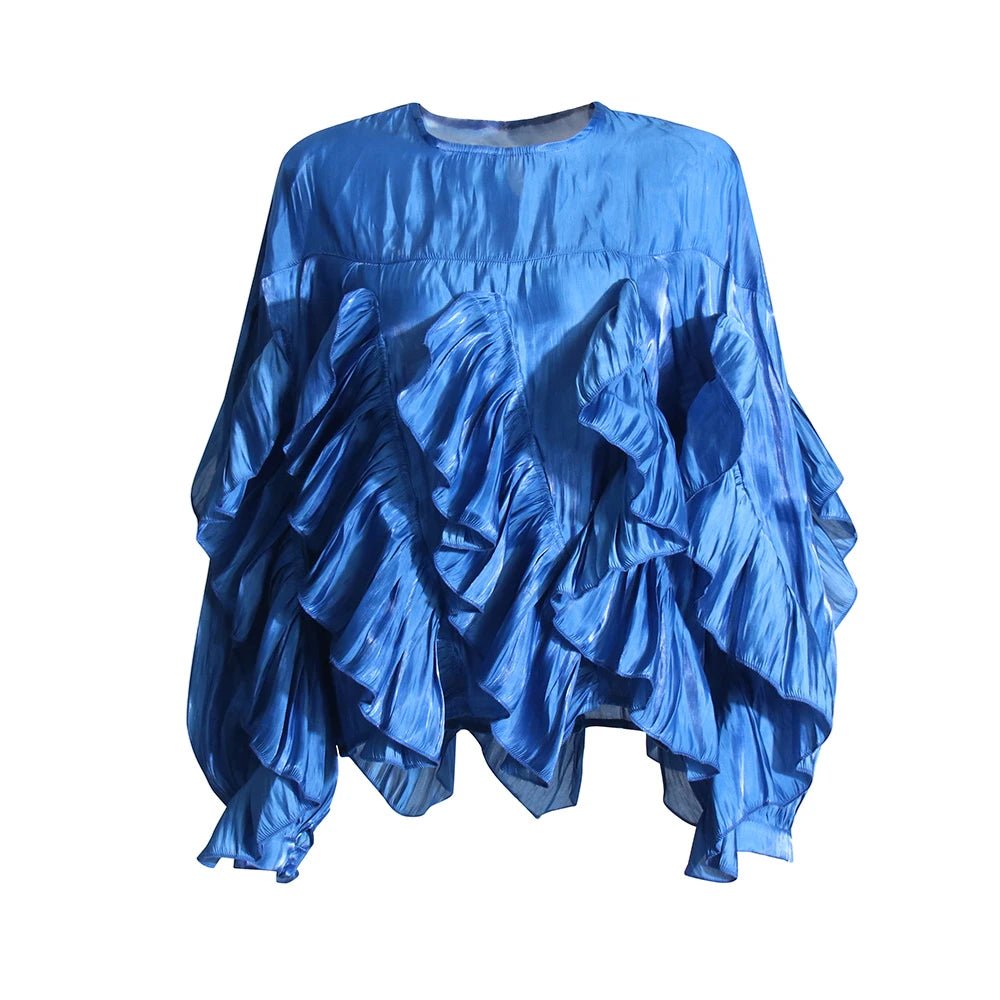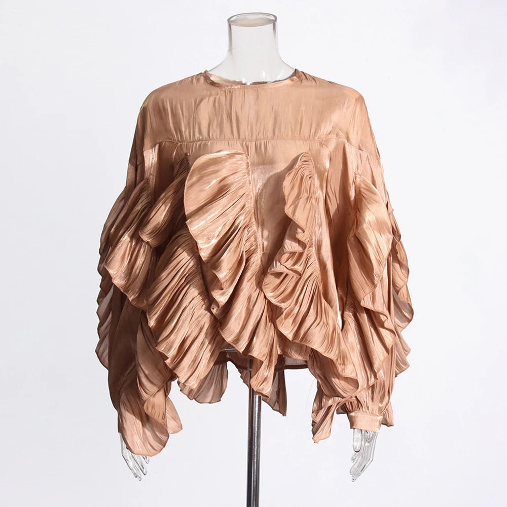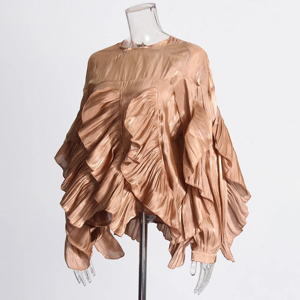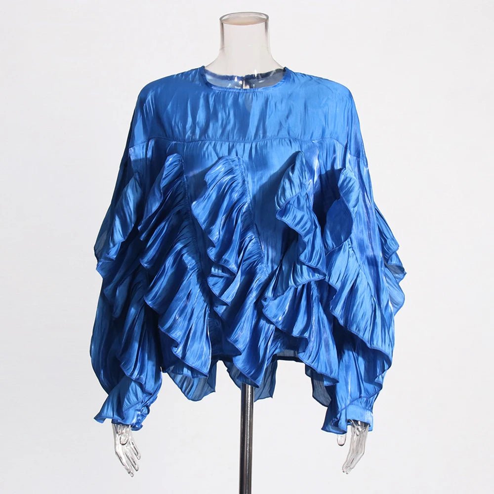 Design: A minimalist, loose-fitting blouse with asymmetrical ruffle details and butterfly sleeves. The pullover style adds a touch of elegance, while the O-neck collar keeps it casual and comfortable.