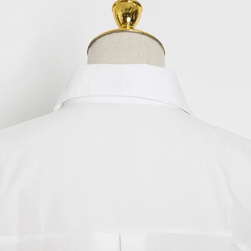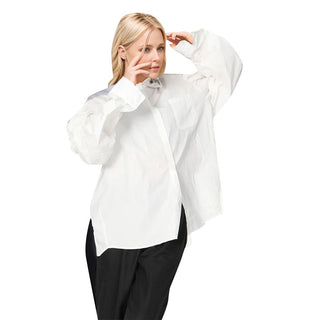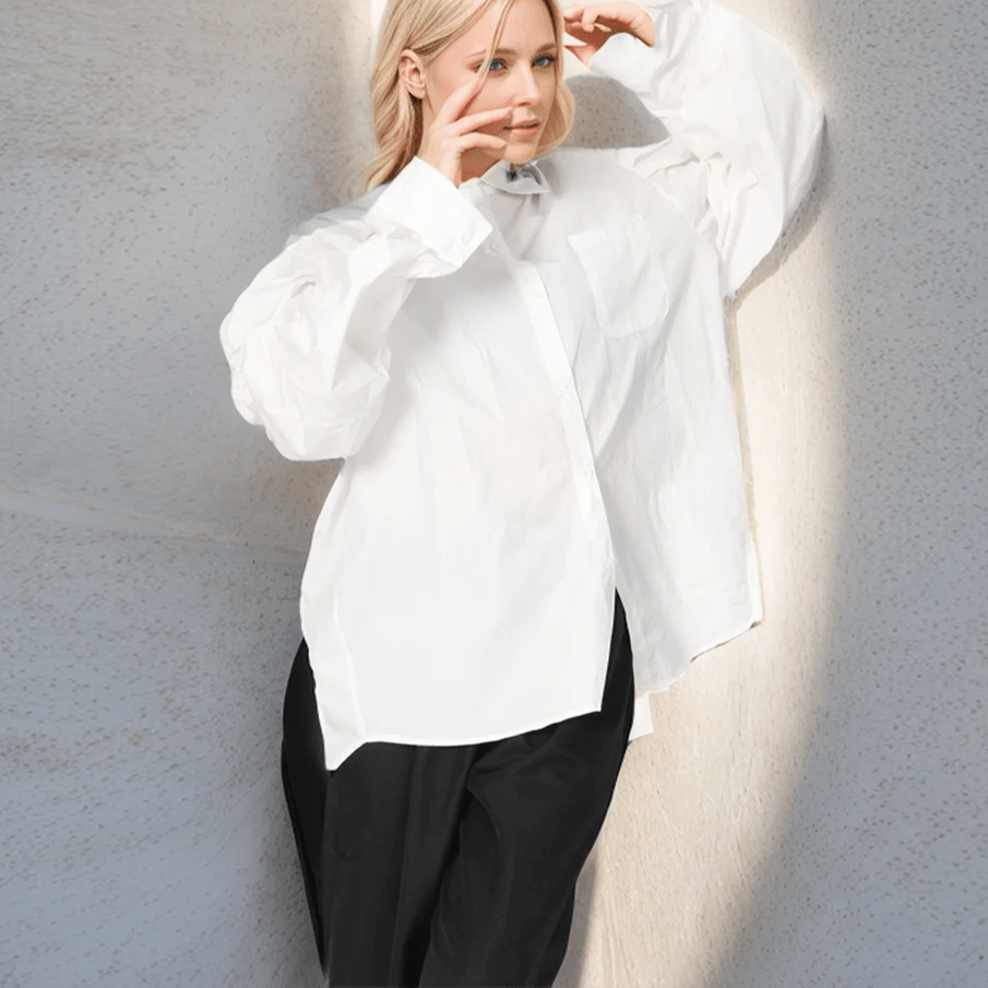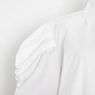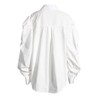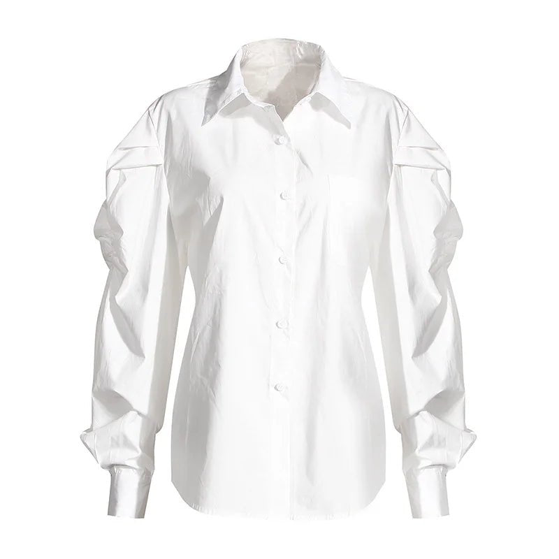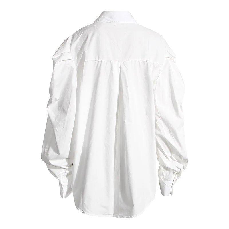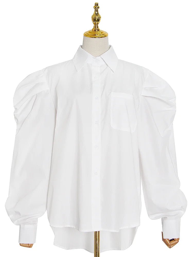 Design: A minimalist puff-sleeve shirt featuring a turn-down collar, full-length sleeves, and a loose-fit silhouette for effortless elegance.