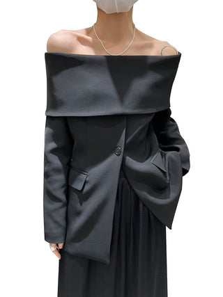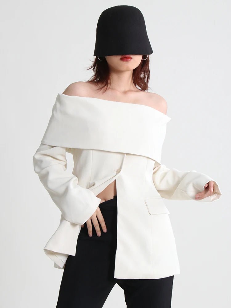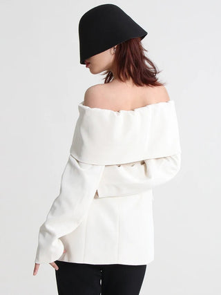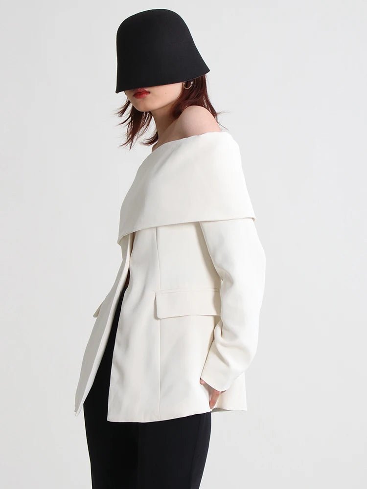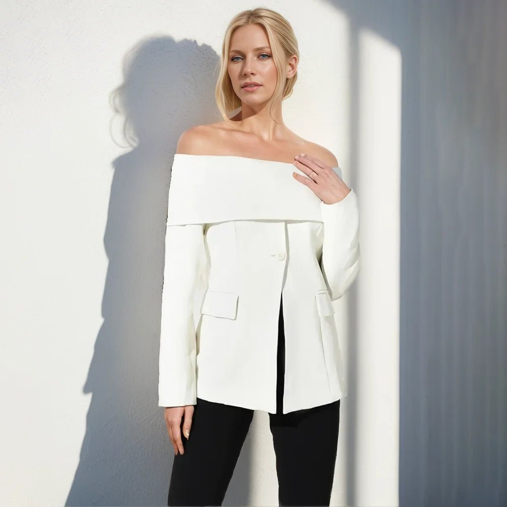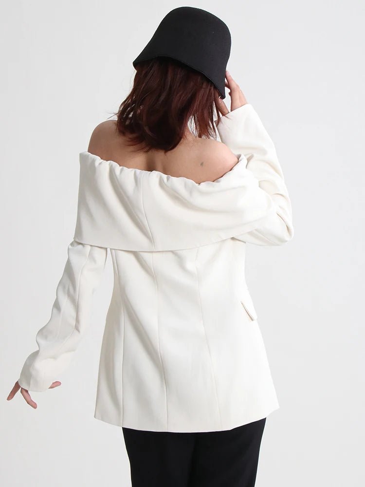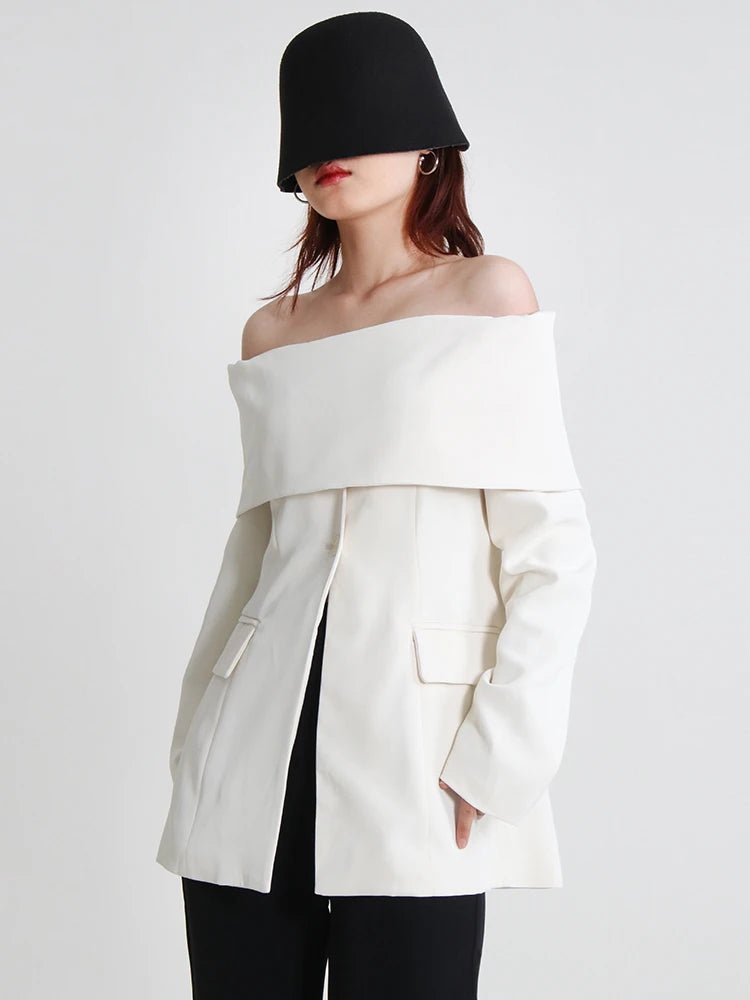 Design: A minimalist solid slash-neck blazer featuring a sleek off-shoulder silhouette, long sleeves, and a straight fit for a polished, office-ready look.