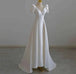 This classic A-line wedding gown is designed with modest elegance in mind. Made from luxurious satin fabric, it features a flattering V-neckline and short sleeves for a refined, sophisticated look. The empire waistline enhances the silhouette, flowing into a graceful A-line shape with a brush train that adds a touch of understated elegance. Perfect for brides seeking a timeless and modest style, this gown blends simplicity with grace, making it an ideal choice for a formal wedding.