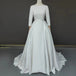 High-end satin bridal gown with a classic O-neckline and full sleeves. This backless ball gown silhouette features elegant ruching and pleated details. Made from matte satin, it includes a sweep train and built-in bra. Customizable with a natural waistline for a timeless and sophisticated bridal look.
