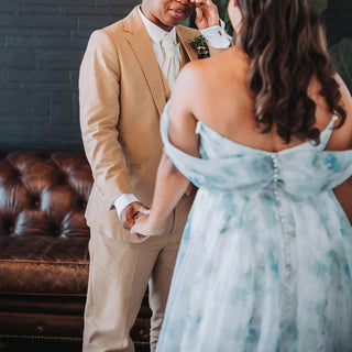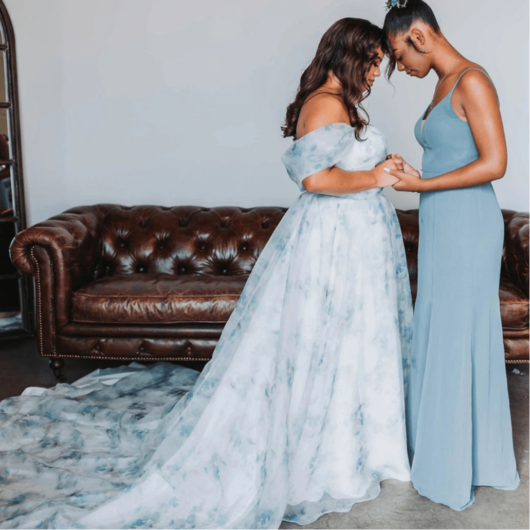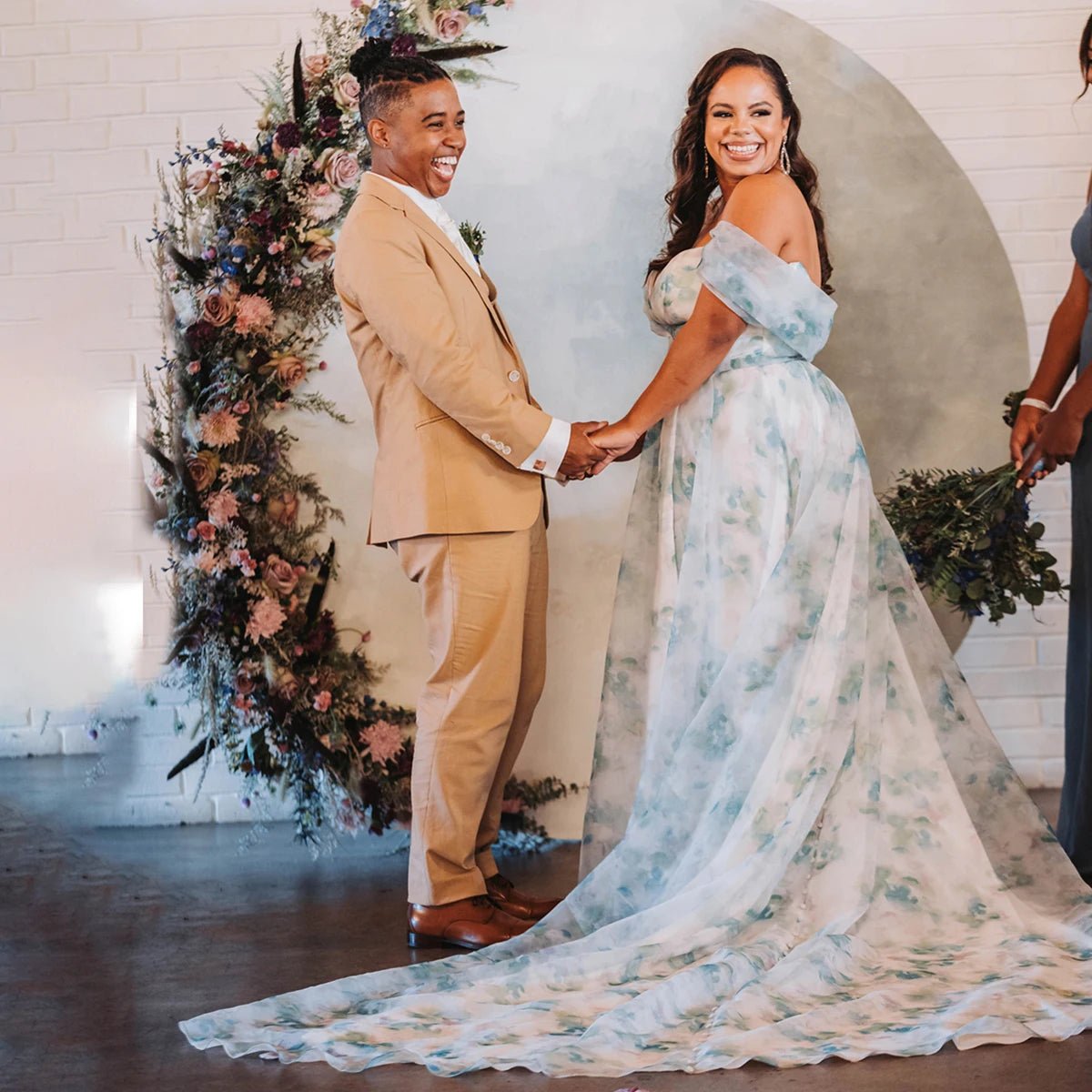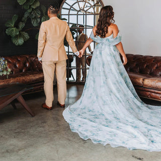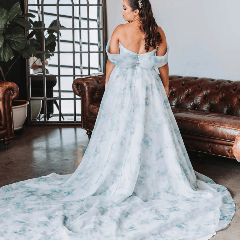 Embrace elegance with this off-shoulder floral print wedding dress. Featuring a sweetheart neckline, sleeveless design, and an A-line silhouette, this gown is crafted from lightweight organza with a colorful touch. The floor-length dress is completed with a chapel train, button-back closure, and a built-in bra for added comfort. Perfect for a romantic and customized bridal look.