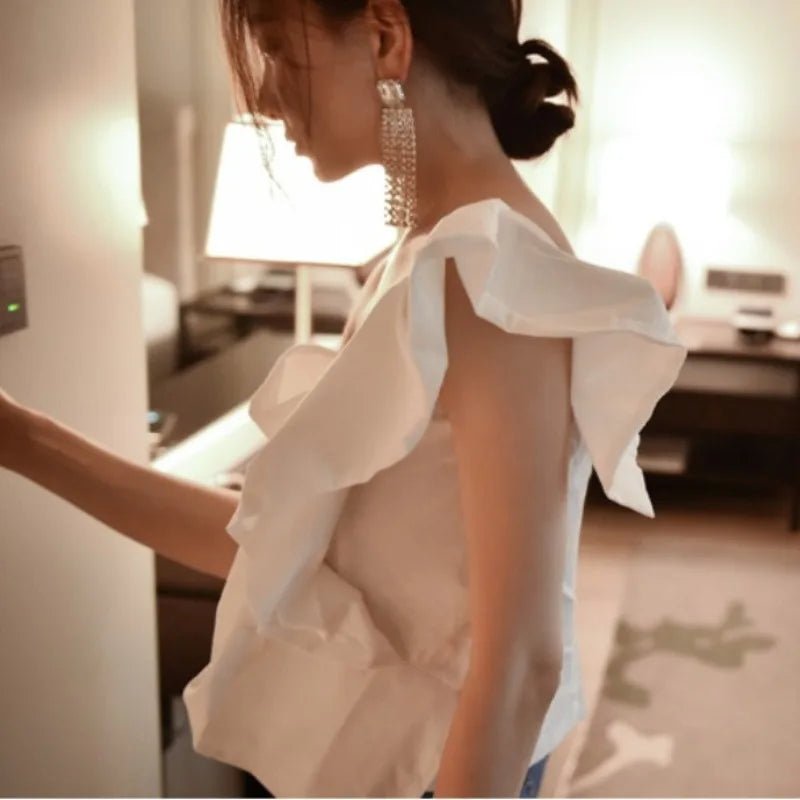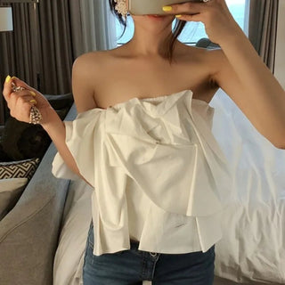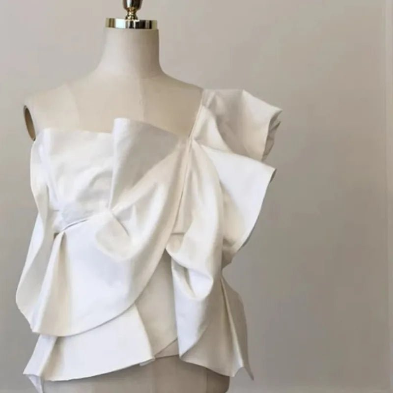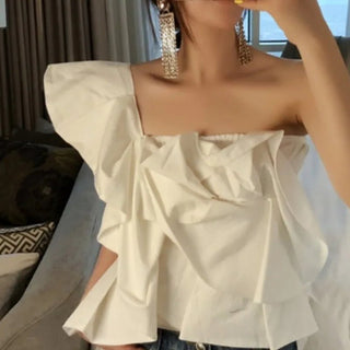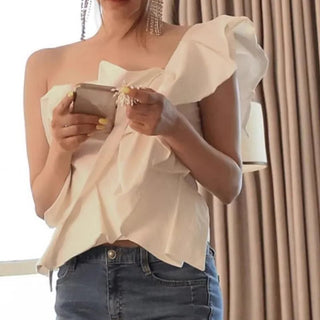 Design: A stylish one-shoulder slim-fit blouse featuring a slash neckline, folded detailing, and a sleek silhouette for a modern touch.