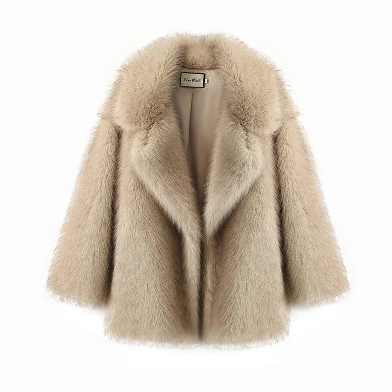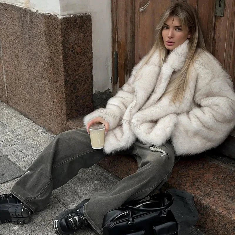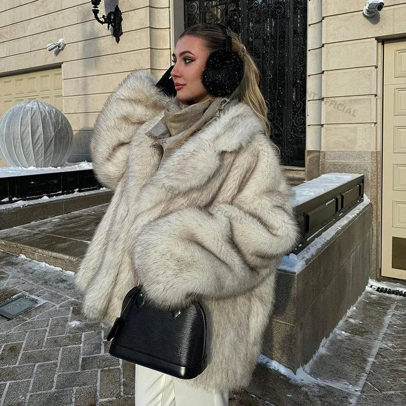 Design: Luxurious oversized gradient faux fur coat with batwing sleeves and a turn-down collar. Designed for ultimate warmth and high-end style, featuring vintage-inspired pockets and a covered button closure.