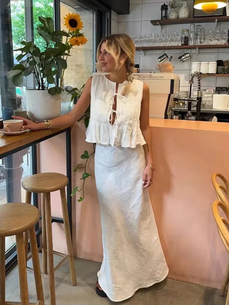 Design: A sophisticated two-piece set featuring a pleated tie-front top with a classic O-neckline paired with a high-waisted A-line ankle-length skirt. The flowing silhouette creates an effortlessly polished and feminine look, perfect for dressing up or down.