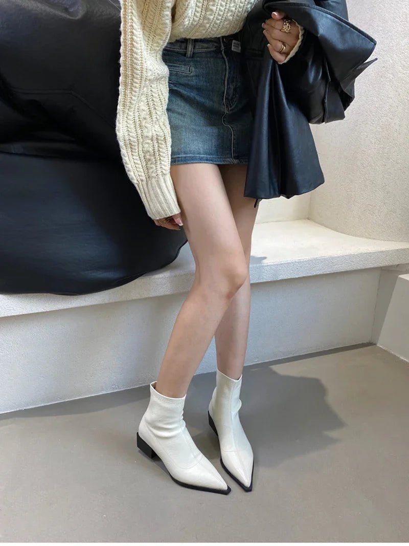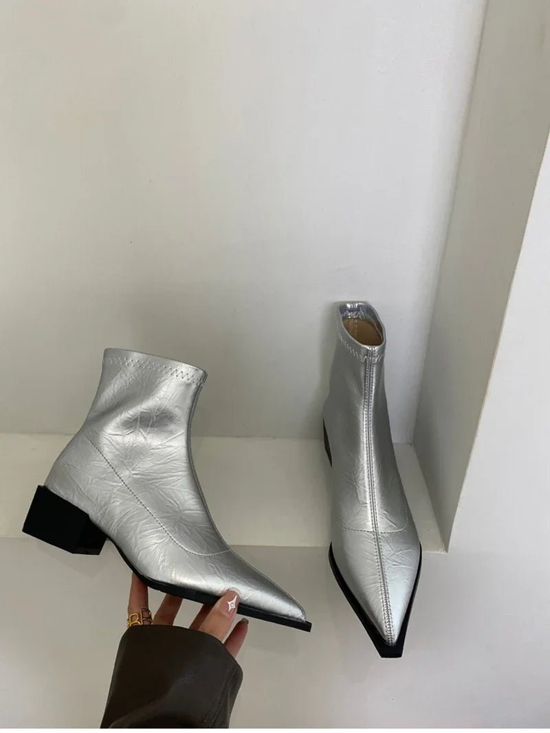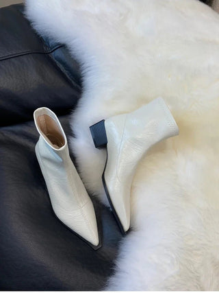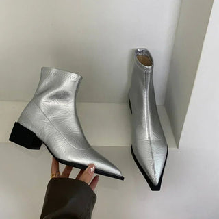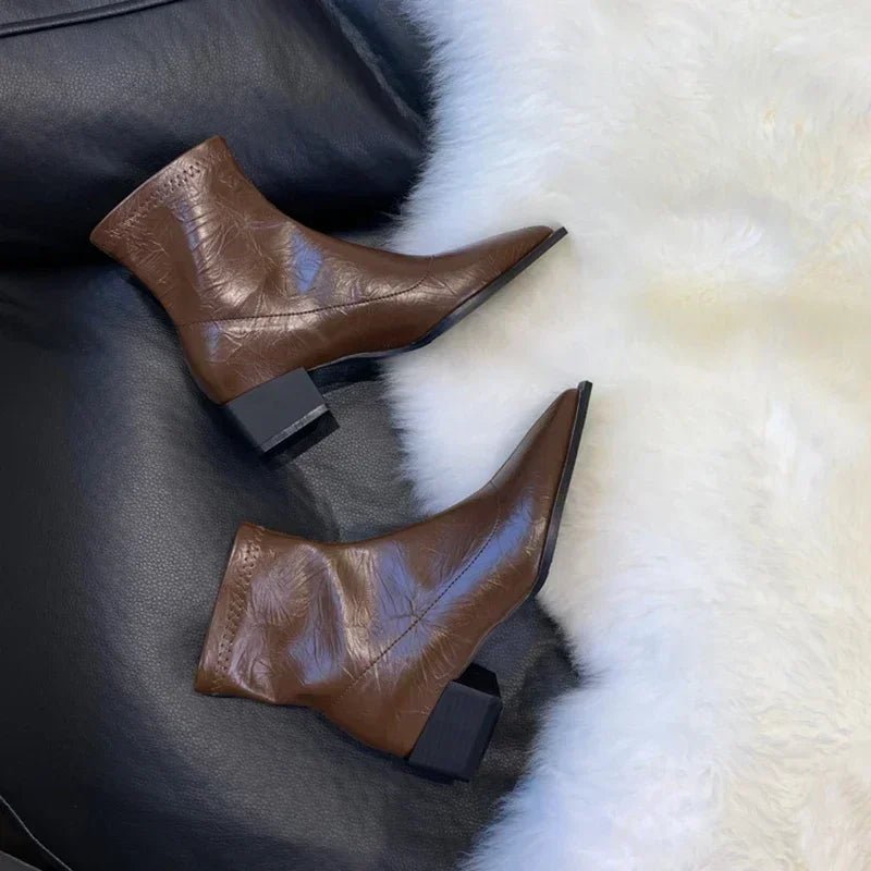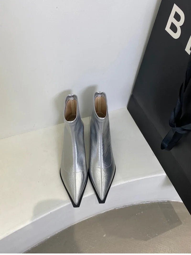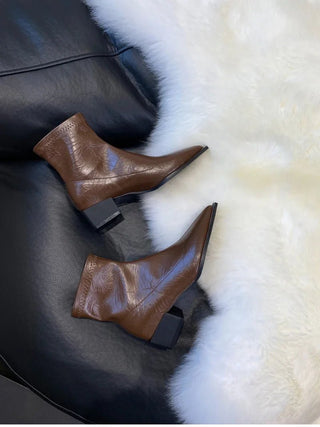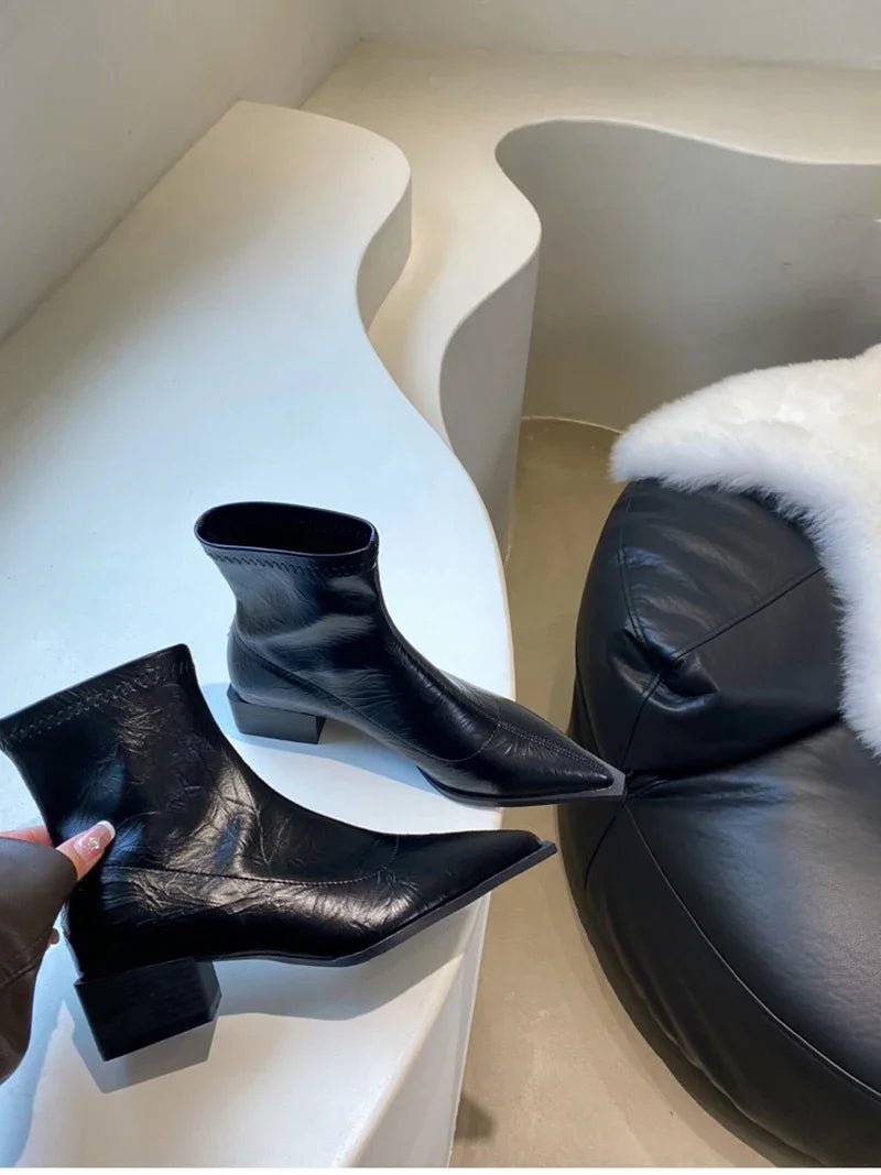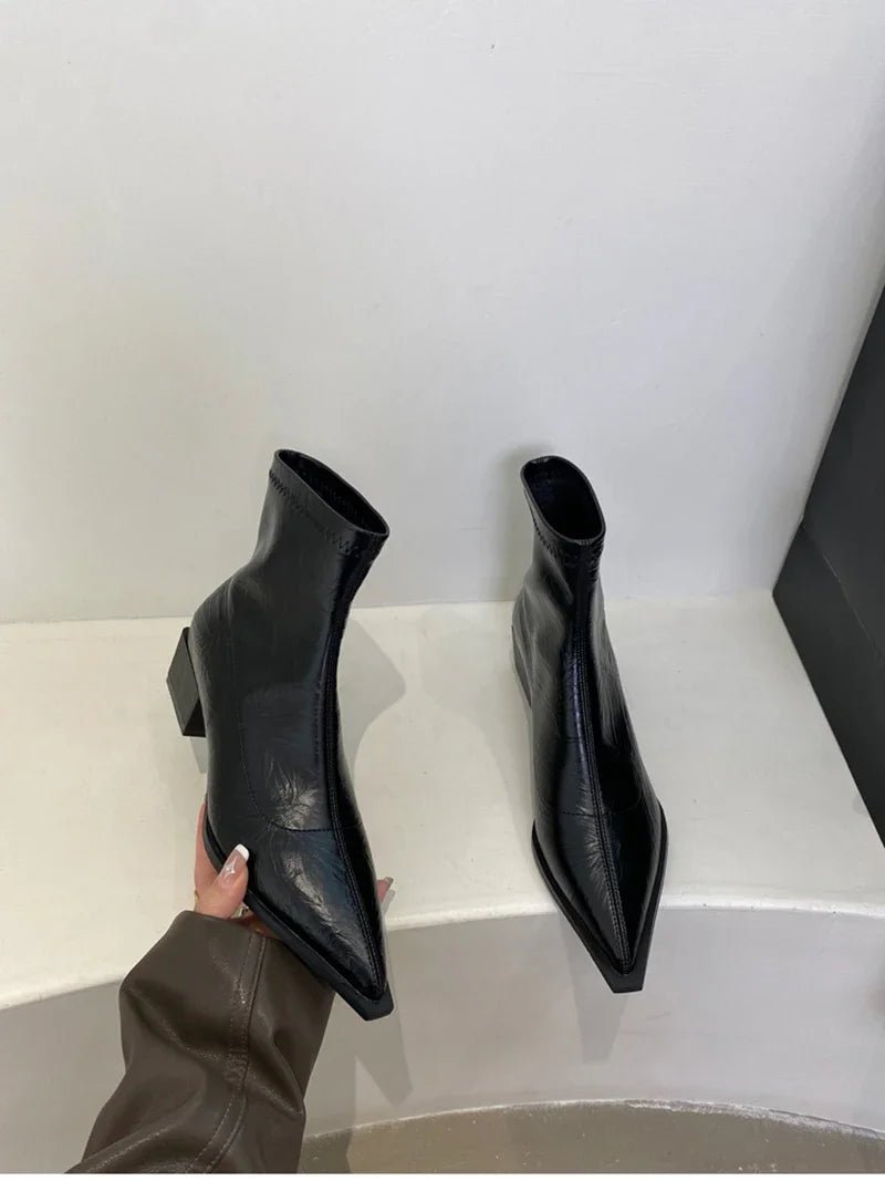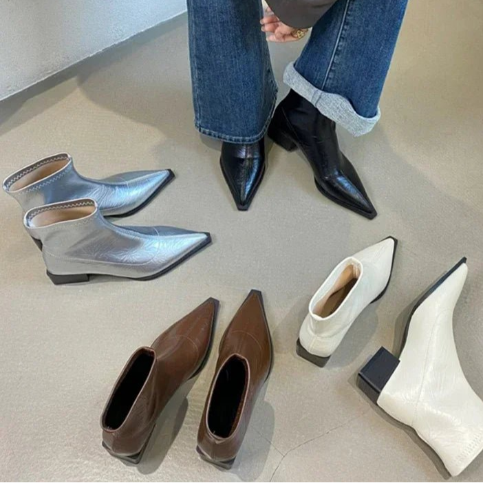 Design: Sleek ankle boots with pointed toe, thick square heel, and subtle stitching. Slip-on style crafted for modern autumn/winter fashion.