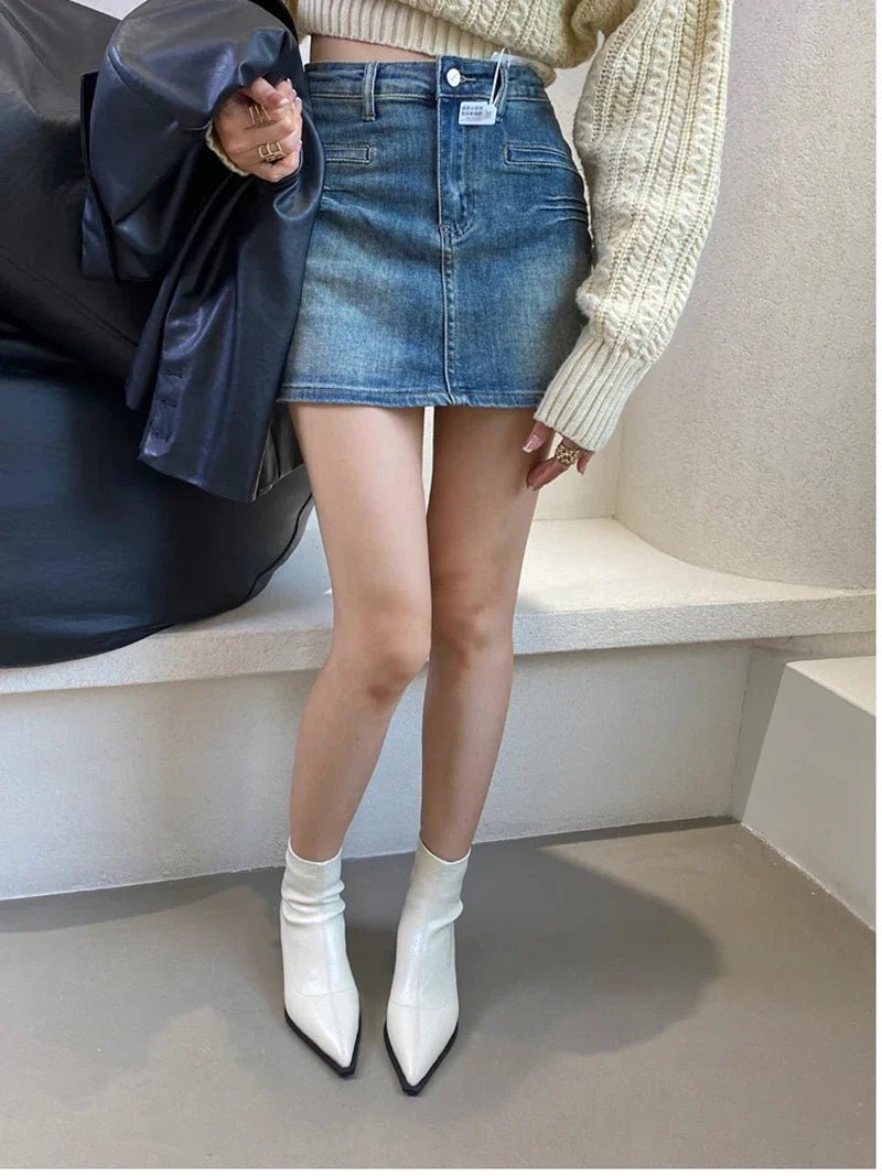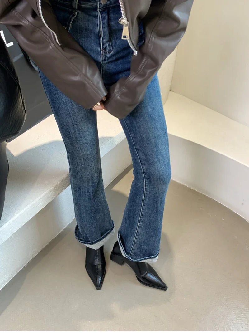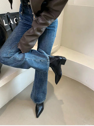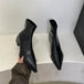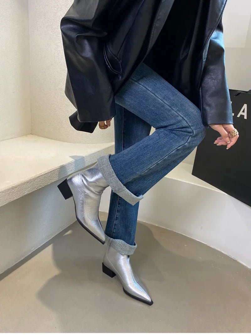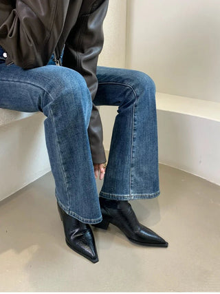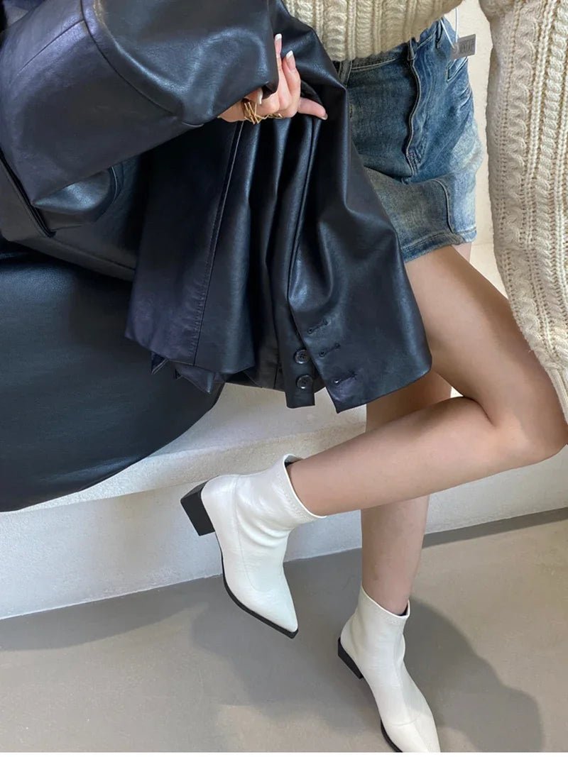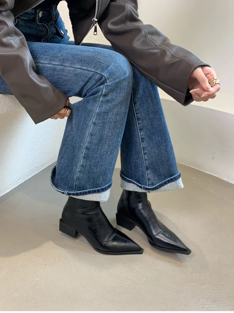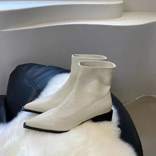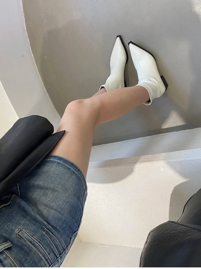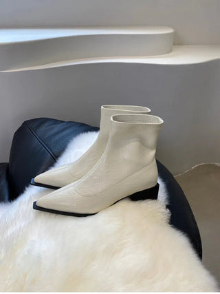Design: Sleek ankle boots with pointed toe, thick square heel, and subtle stitching. Slip-on style crafted for modern autumn/winter fashion.