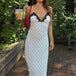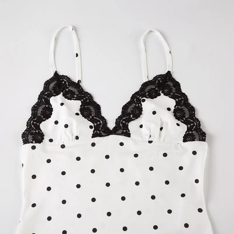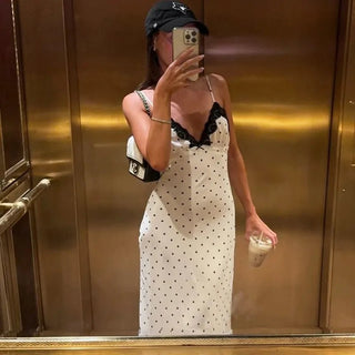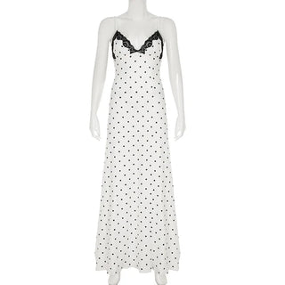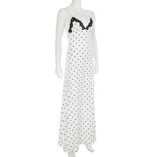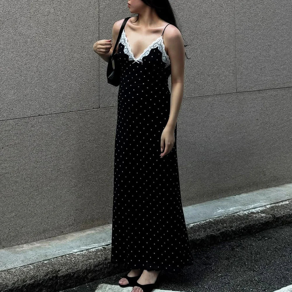 Design: A chic polka dot sleeveless long dress featuring a stylish lace decoration. The ankle-length dress has a straight silhouette with a natural waistline, perfect for creating a sophisticated yet casual look.
