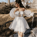 Design: Puff Sleeve Mini Wedding Dress featuring a sweetheart neckline, full lantern sleeves, and an illusion-inspired silhouette with pleated details.
