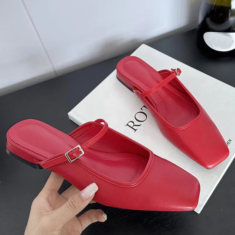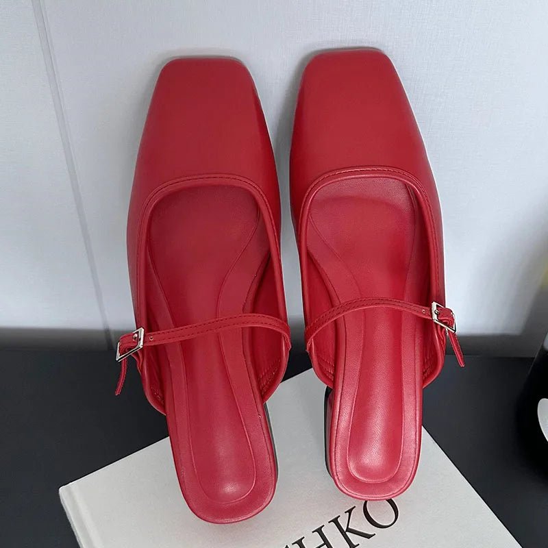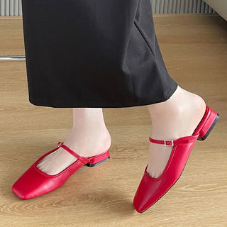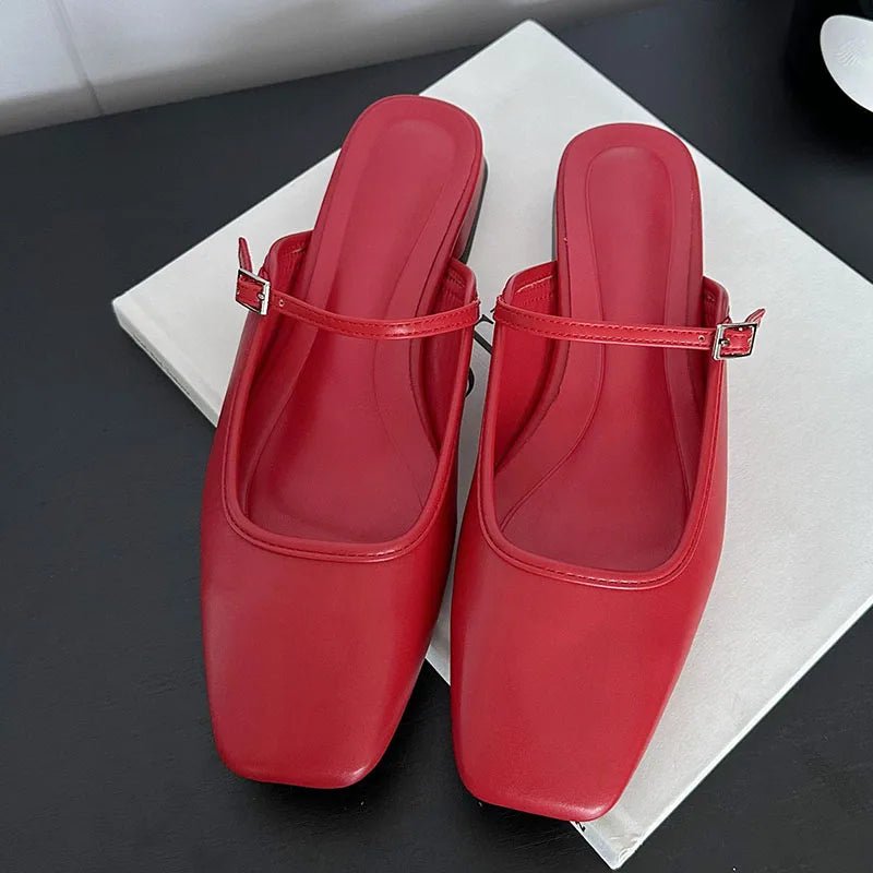 Design: Minimalist red square-toe flat mules featuring a shallow cut and a sleek, concise silhouette. Perfect for effortless everyday elegance.