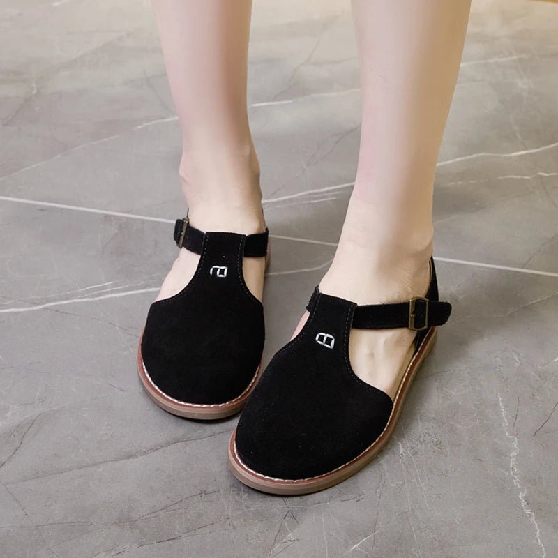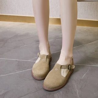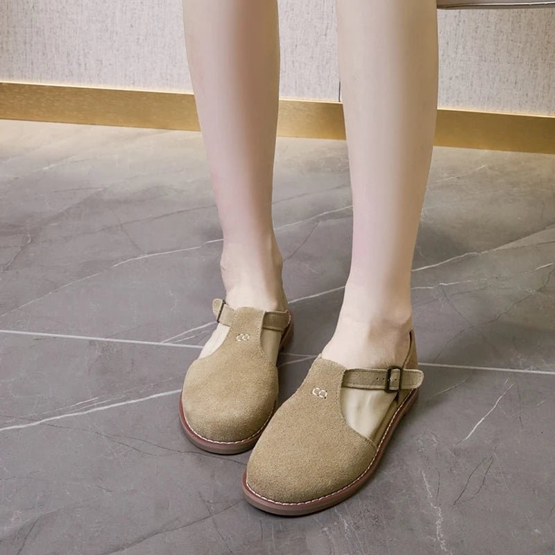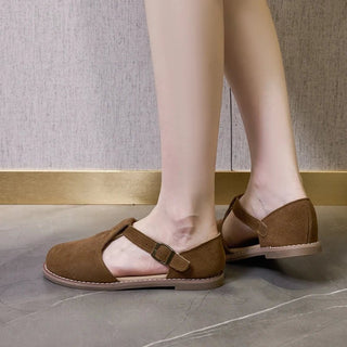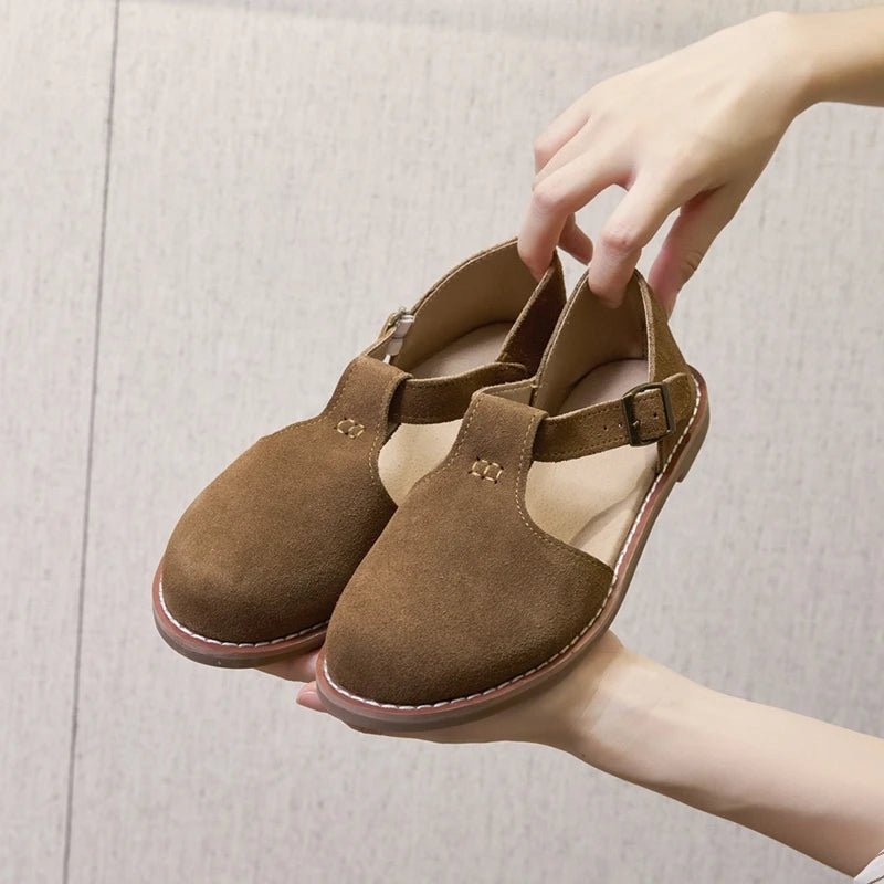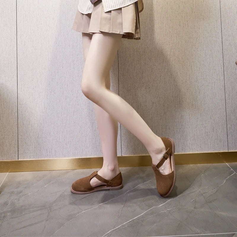 Design: Timeless retro-inspired flat sandals featuring a frosted genuine leather upper, delicate embroidery, and a secure buckle strap closure for a perfect fit.