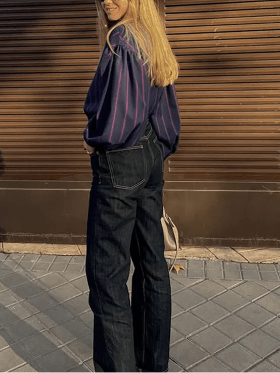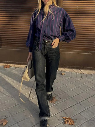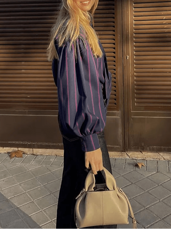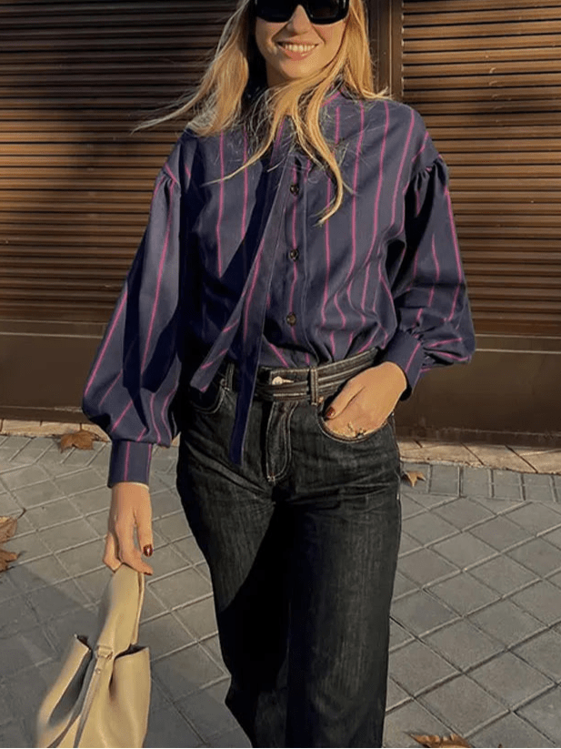 Design: This elegant blouse features a delicate ruffle collar with a chic lace-up bow detail, adding a touch of sophistication. The striped pattern and flowing silhouette create a refined yet effortless look.