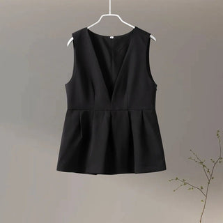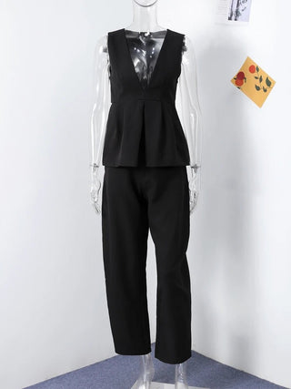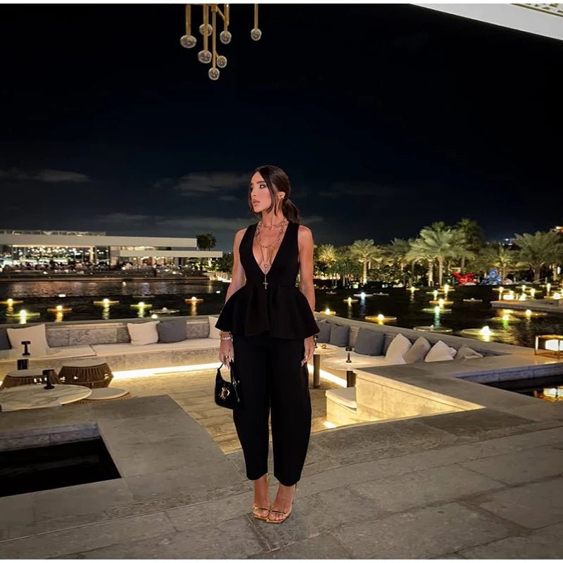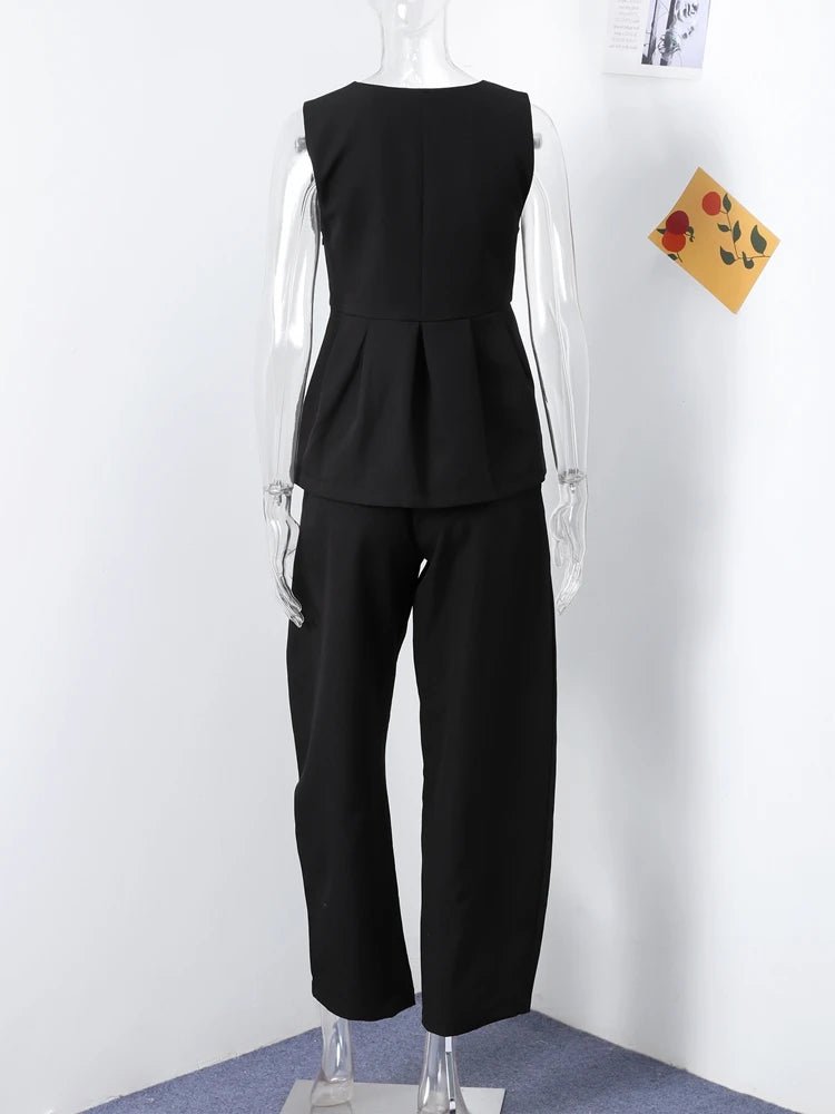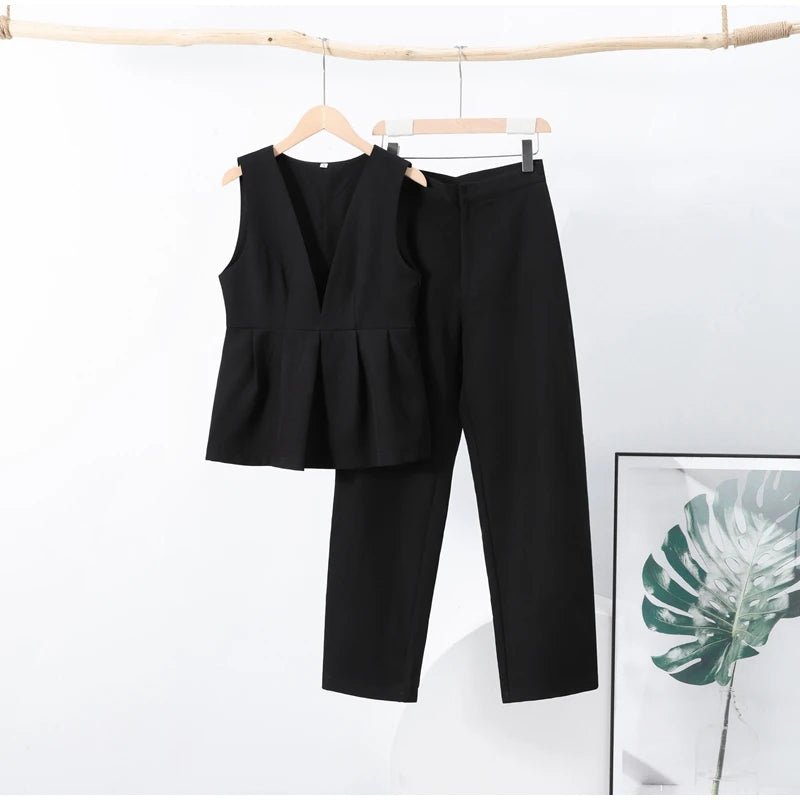 Design: A trendy and comfortable ruffled hem tank top and pants set, featuring a V-neck top with a zipper detail and wide-leg pants. The set’s loose, relaxed fit and high waist offer both style and comfort for everyday wear.