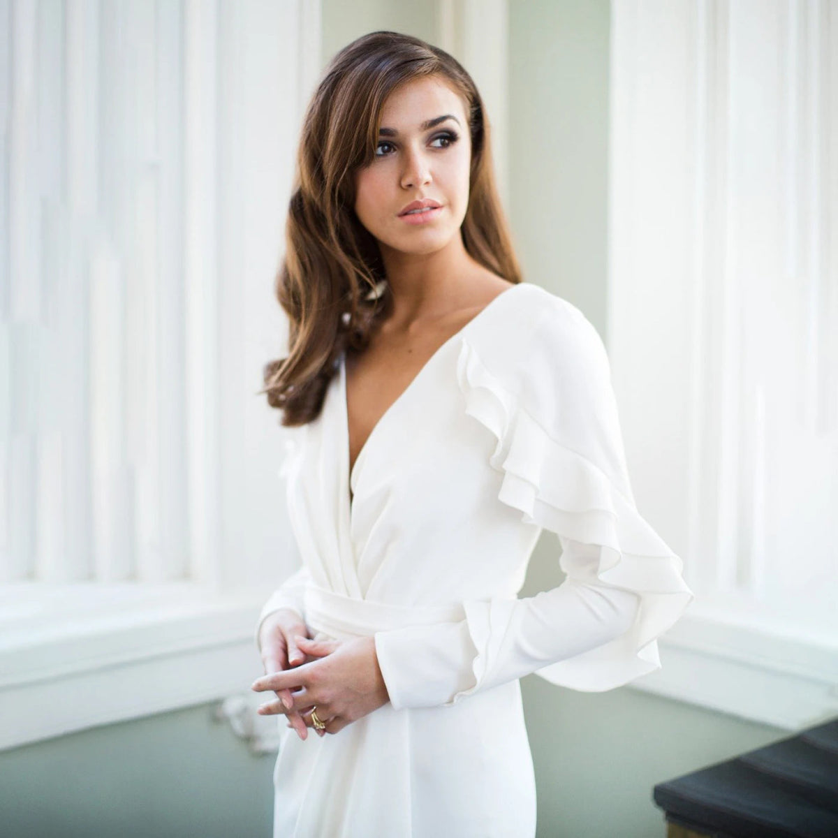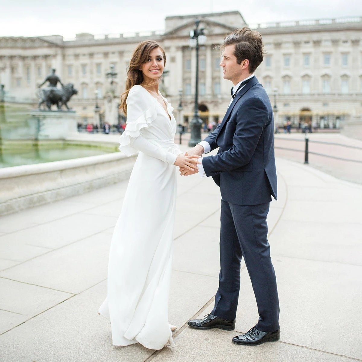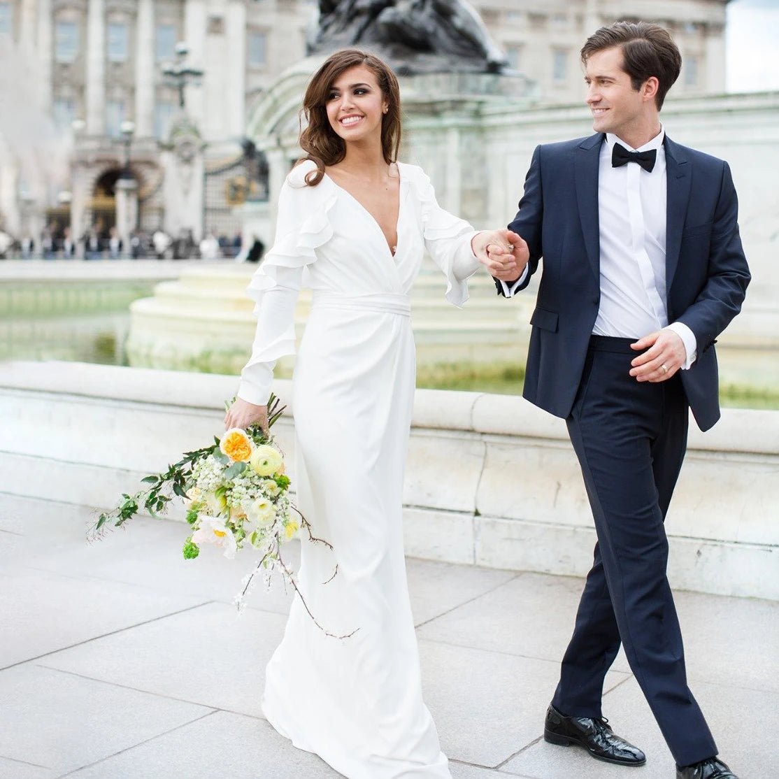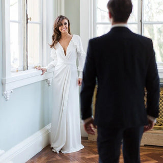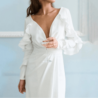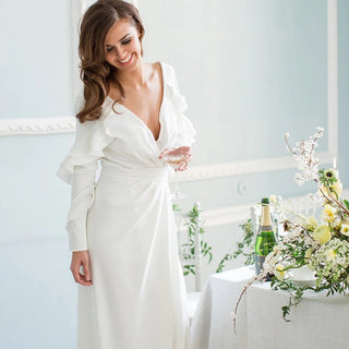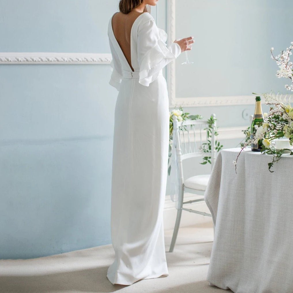 Elegant sheath wedding gown with long flared ruffled sleeves, ruched V-neckline, and open back. Made with satin chiffon, featuring a floor-length design and built-in bra. Customizable plus-size options available for a simple, timeless bridal look.