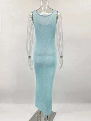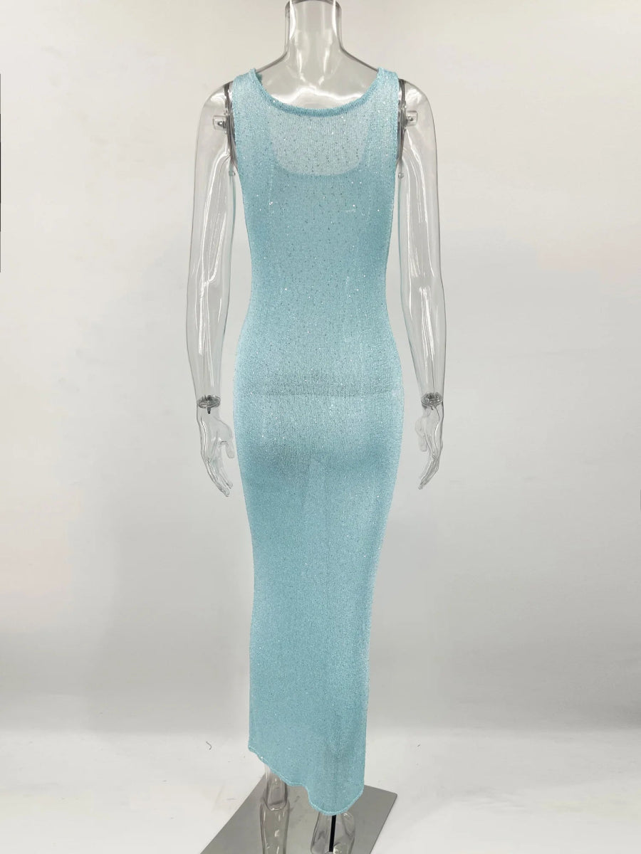 Design: Elegant backless maxi dress with a scoop neckline and sleeveless design, adorned with see-through sequin patchwork for a glamorous, sparkling finish.