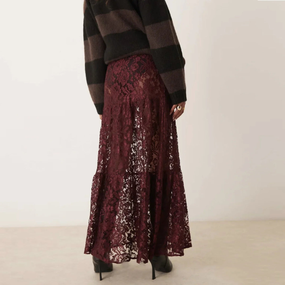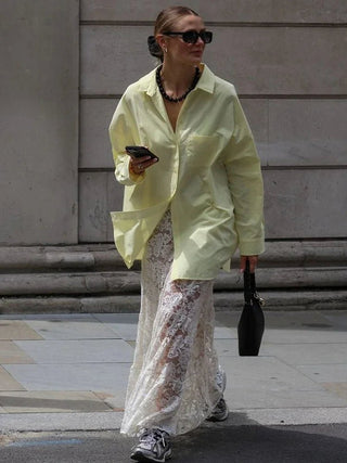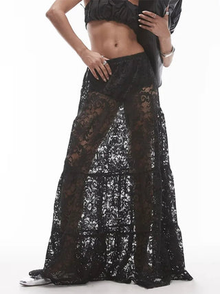 Design: A sheer lace see-through skirt with a straight silhouette and high empire waistline. Designed in a solid tone, this ankle-length piece combines streetwear edge with feminine flair for an effortlessly bold look.