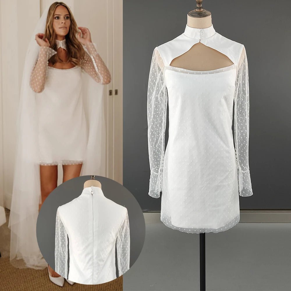 Design: A simple mini wedding dress featuring a high neckline, sheer full sleeves, and an illusion back. The sheath silhouette creates a sleek and modern bridal look.