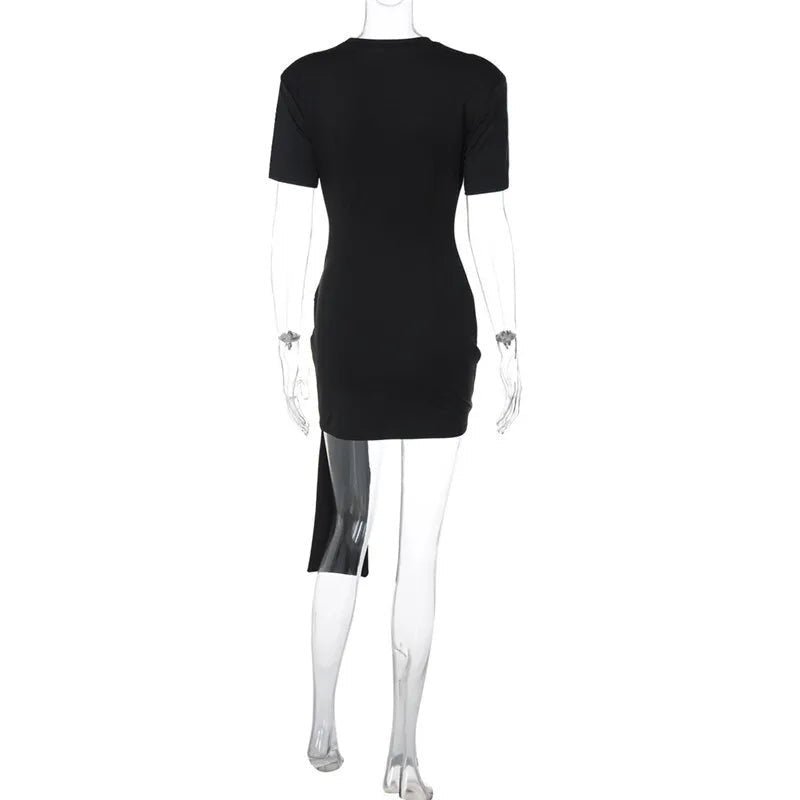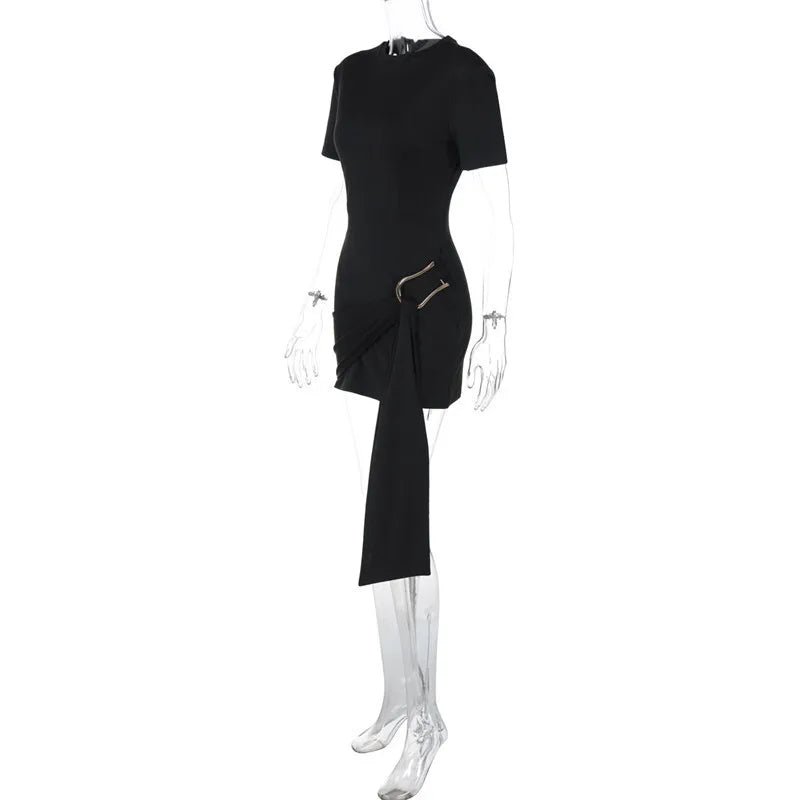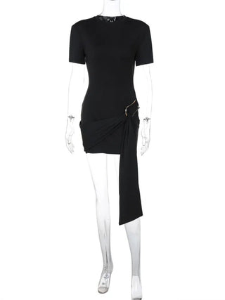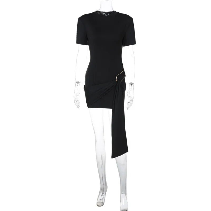 Design: A stylish and elegant mini dress featuring a draped design that flows gracefully, enhancing the slim A-line silhouette. The short sleeves and O-neckline offer a flattering yet modest touch, making it perfect for both casual and dressier occasions.