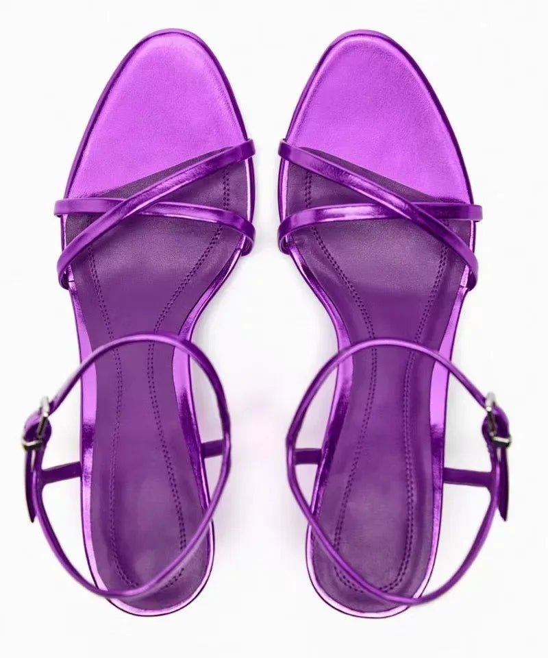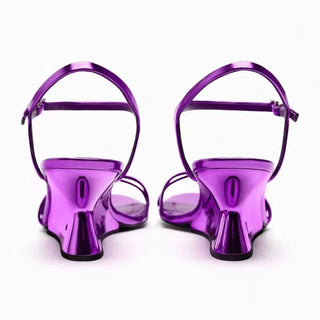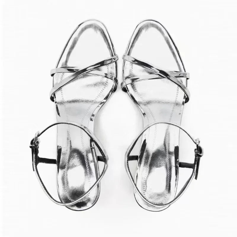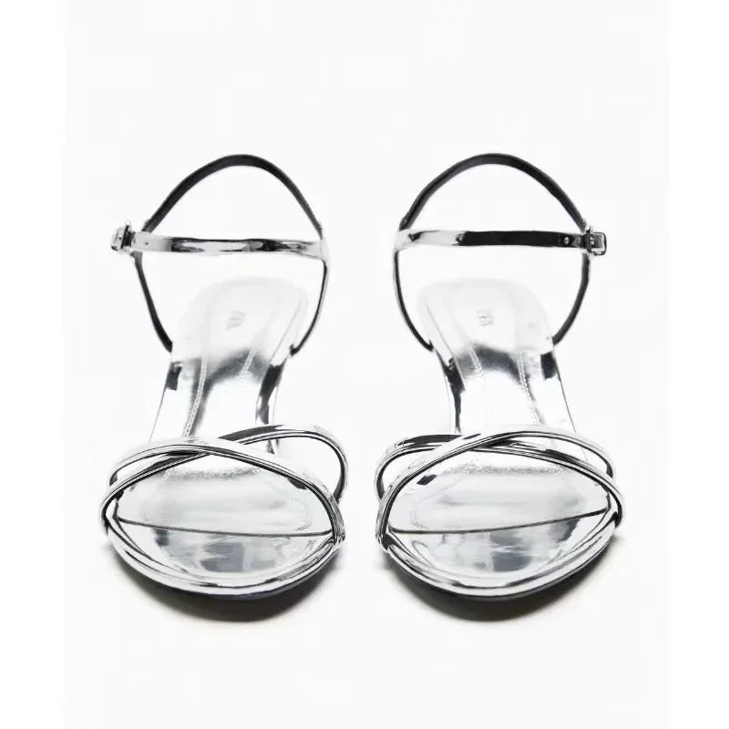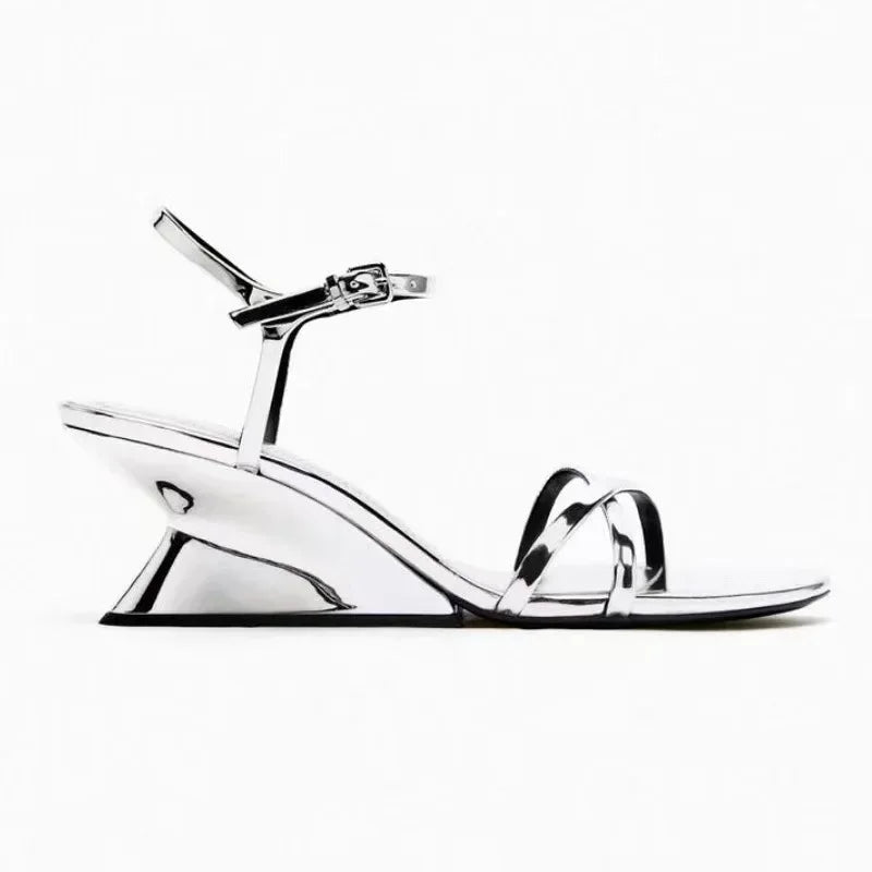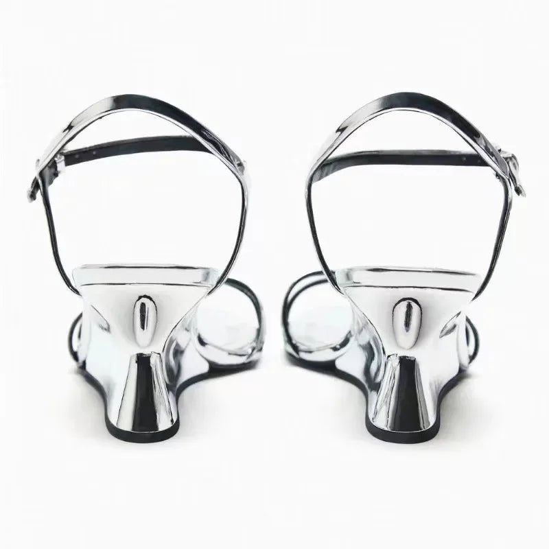 Design: Elegant high-heel sandals featuring a sleek silver finish, an open vamp for breathability, and a secure buckle strap closure. The wedge heel provides both height and stability, making them a stylish yet practical choice.