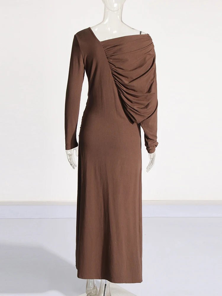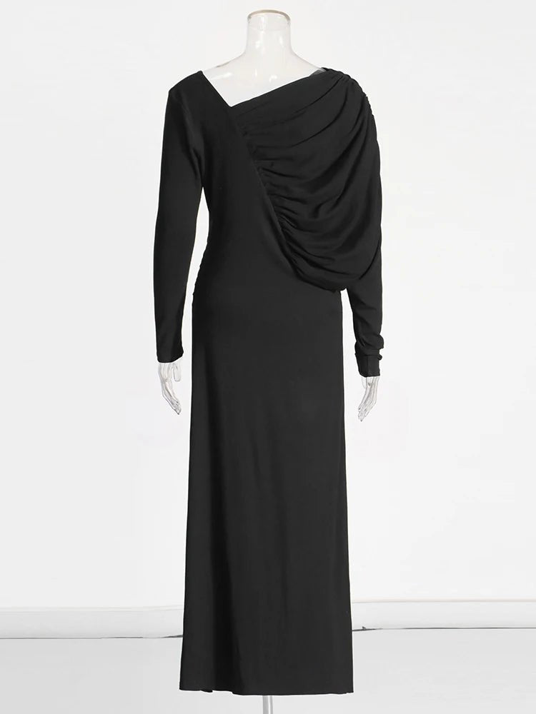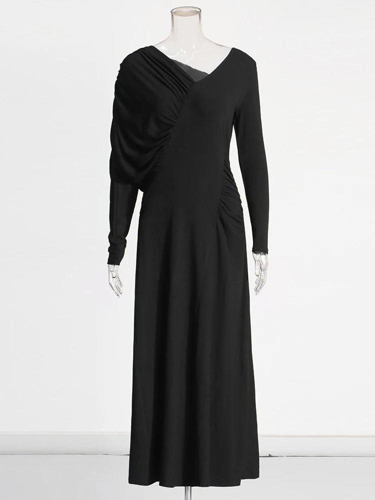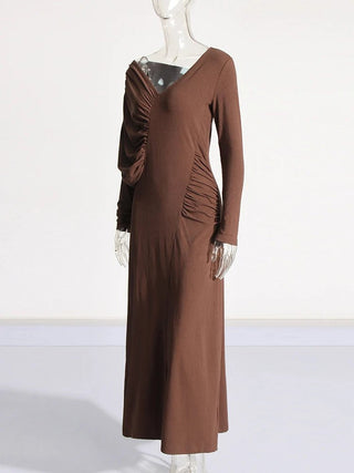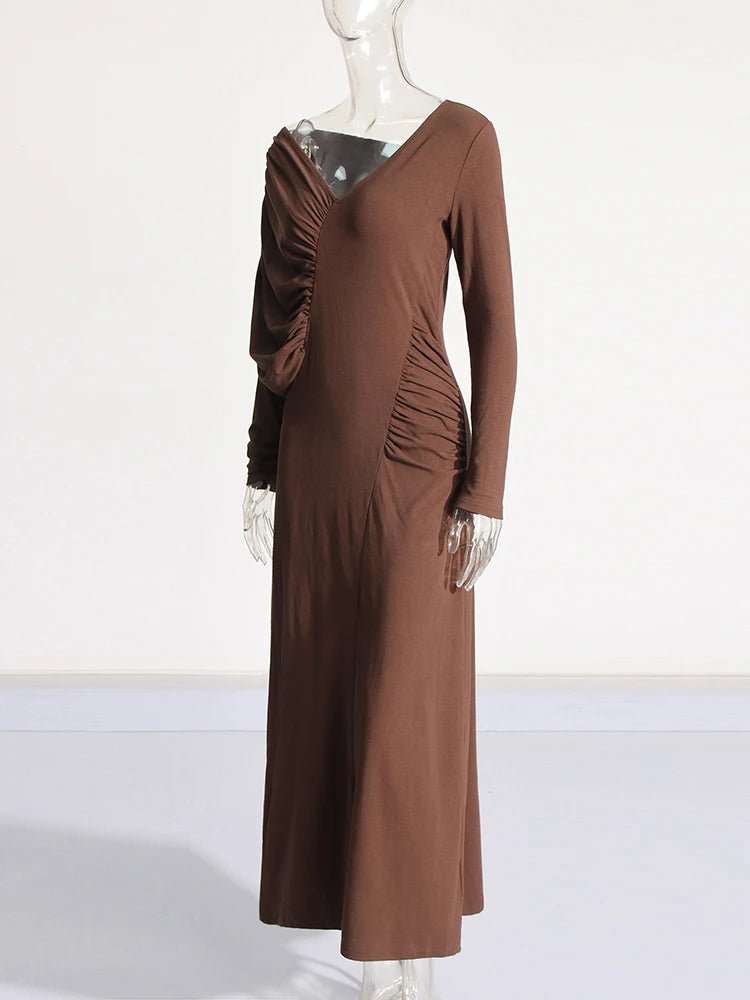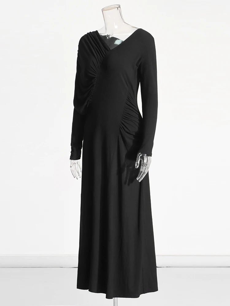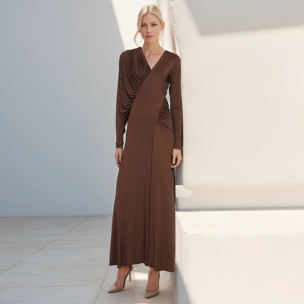 Design: A sophisticated long-sleeve high-waist dress featuring elegant patchwork details. The ankle-length A-line silhouette enhances the feminine appeal, making it a timeless addition to any wardrobe.