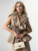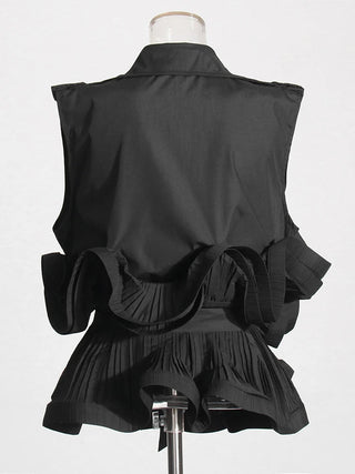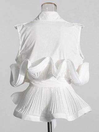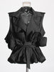 Design: A chic and sophisticated spliced folds shirt with a turn-down collar, sleeveless design, and a unique patchwork lace-up detail. The solid pattern and open stitch decoration create an elegant, office-ready look with a modern touch.