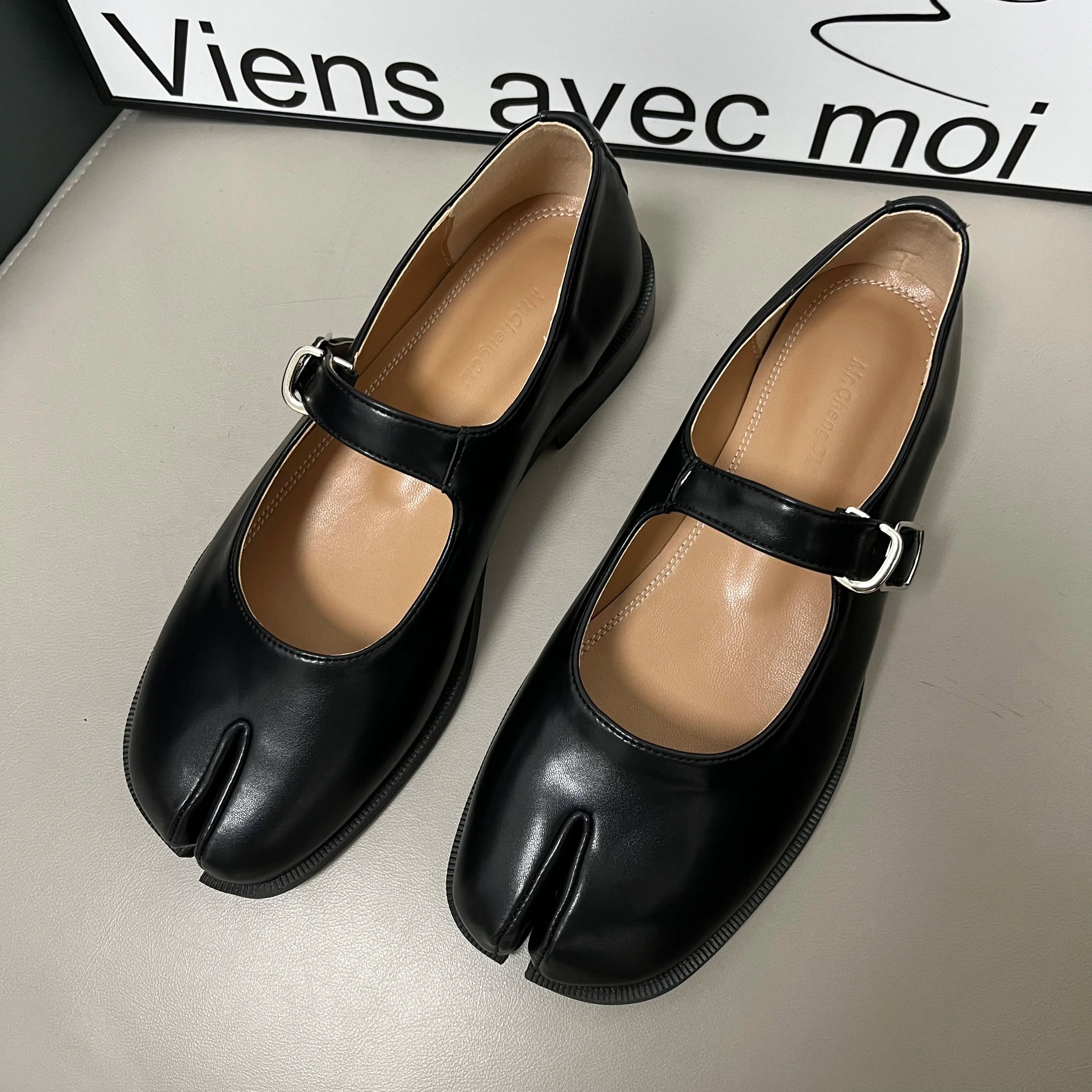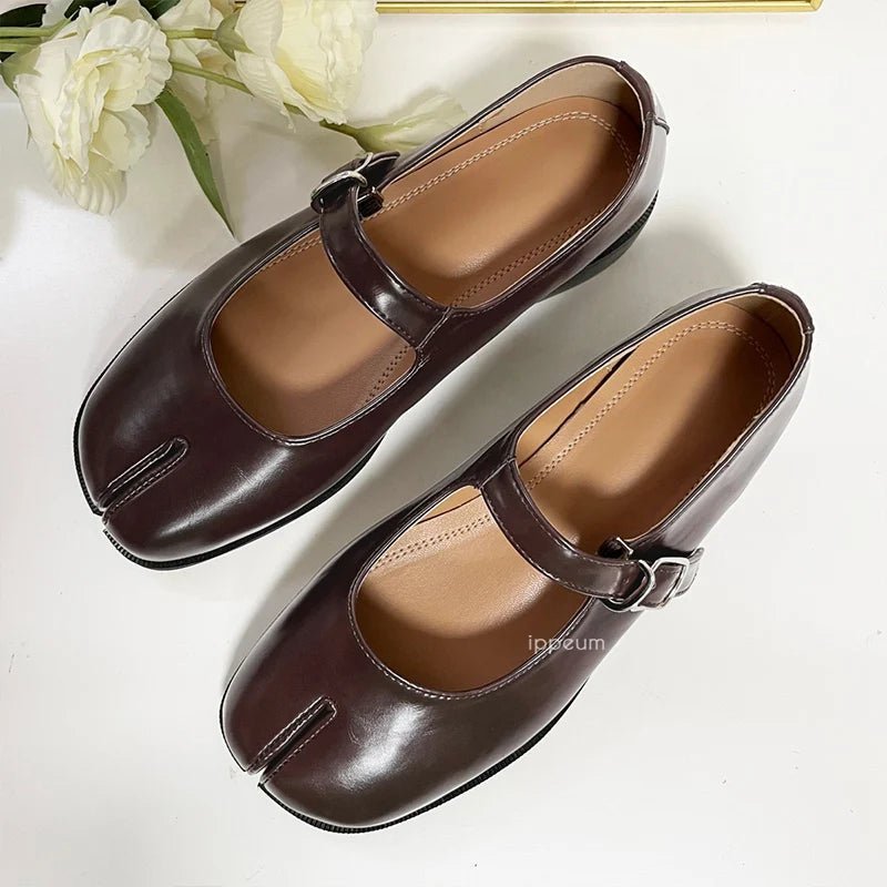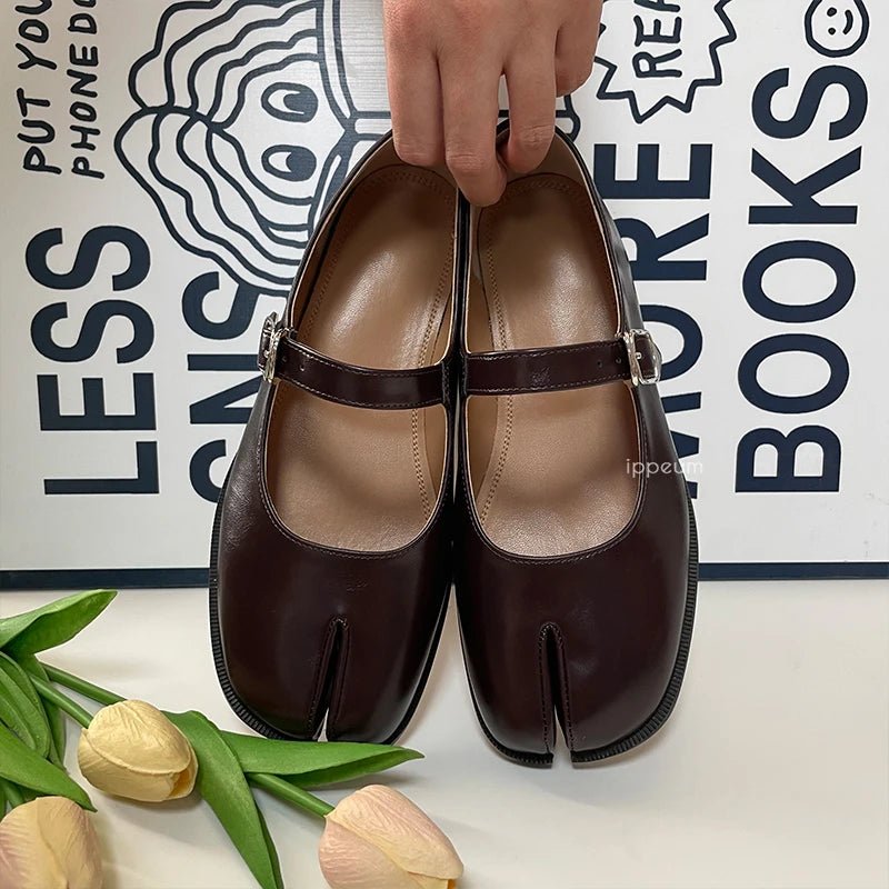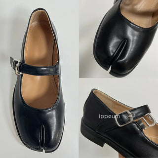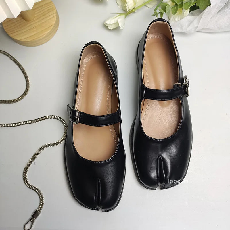 Design: Minimalist split-toe leather Mary Jane flats featuring a classic buckle strap closure and a streamlined, concise silhouette. The split-toe detail adds a modern twist to a timeless style.