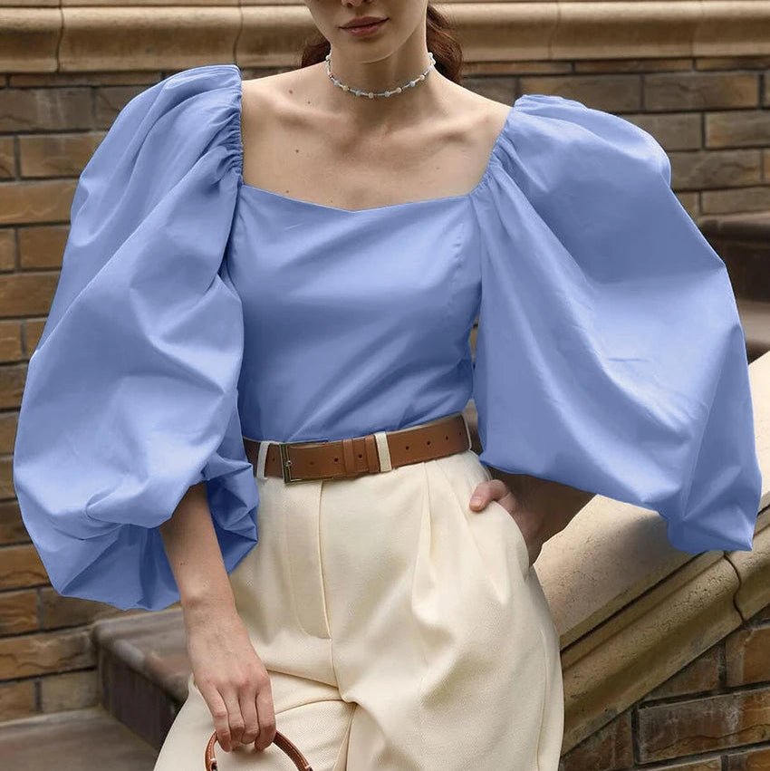 Design: A chic and elegant loose-fit blouse featuring a square collar and puff sleeves. The solid color and satin fabric create a sophisticated, casual look that’s perfect for everyday wear.